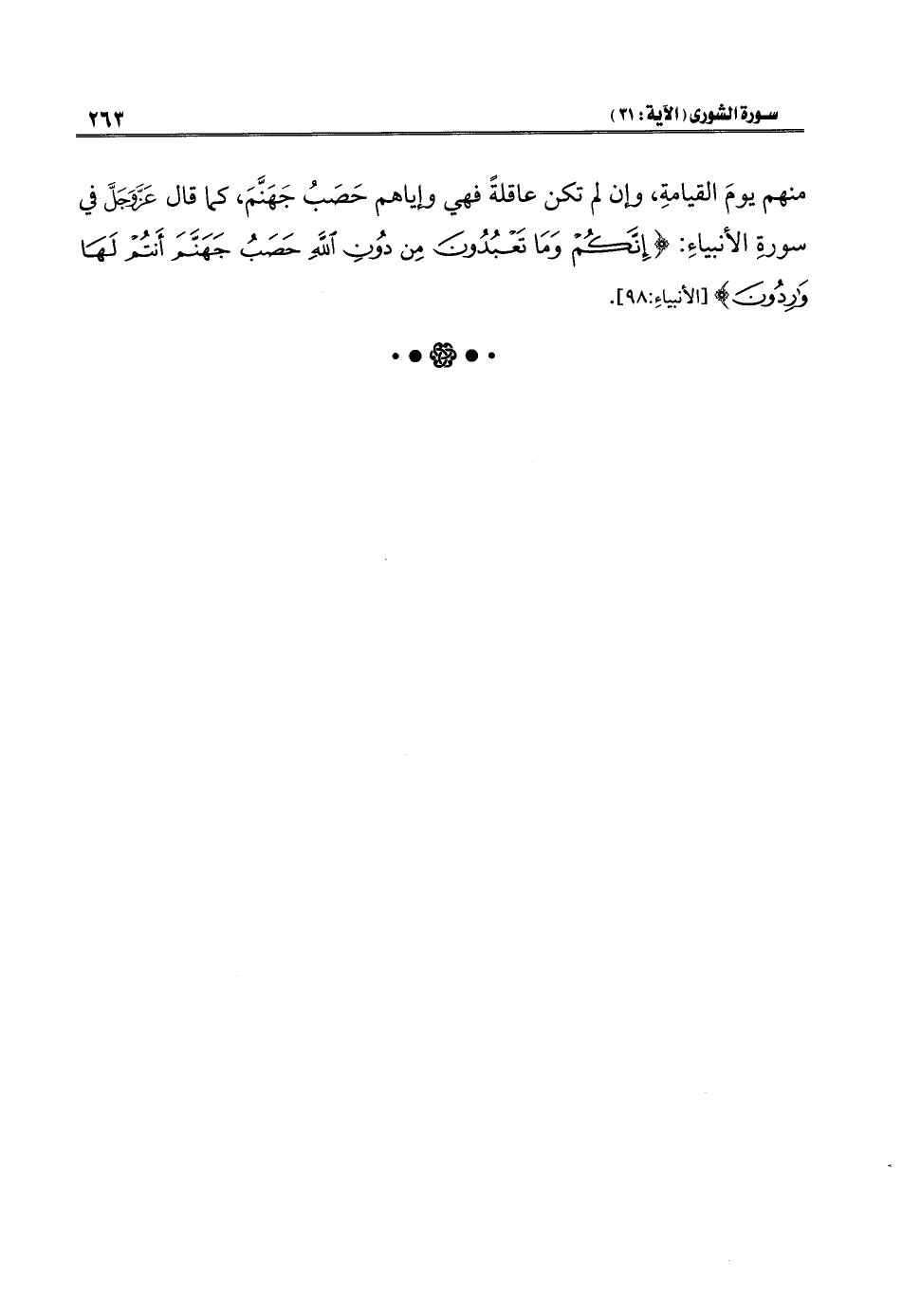 منهم يومَ القيامةِ، وإن لم تكن عاقلةً فهي وإياهم حَصَبُ جَهَنَّمَ، كما قال عَزَّ وَجَلَّ في سورةِ الأنبياءِ: {إِنَّكُمْ وَمَا تَعْبُدُونَ مِنْ دُونِ اللَّهِ حَصَبُ جَهَنَّمَ أَنْتُمْ لَهَا وَارِدُونَ} [الأنبياء: ٩٨].
