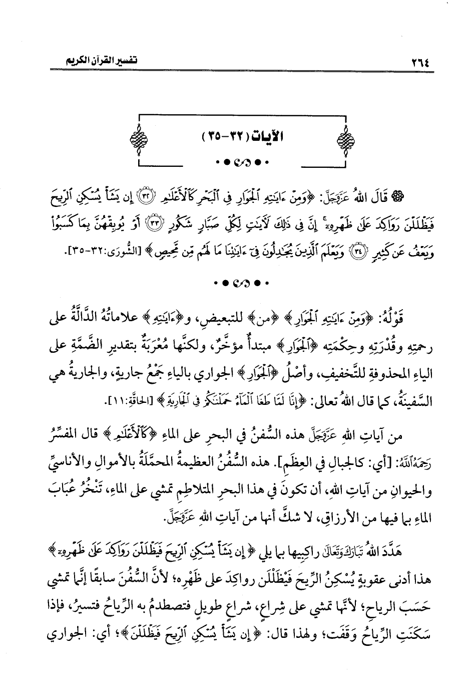 من آياتِ اللهِ عَزَّ وَجَلَّ هذه السُّفنُ في البحرِ على الماءِ {كَالْأَعْلَامِ} قال المفسِّرُ رَحِمَهُ اللهُ: [أي: كالجبالِ في العِظَمِ]. هذه السُّفُنُ العظيمةُ المحمَّلَةُ بالأموالِ والأناسيِّ والحيوانِ من آياتِ اللهِ، أن تكونَ في هذا البحرِ المتلاطِمِ تمشي على الماءِ، تَنْخُرُ عُبَابَ الماءِ بما فيها من الأرزاقِ، لا شكَّ أنها من آياتِ اللهِ عَزَّ وَجَلَّ.
