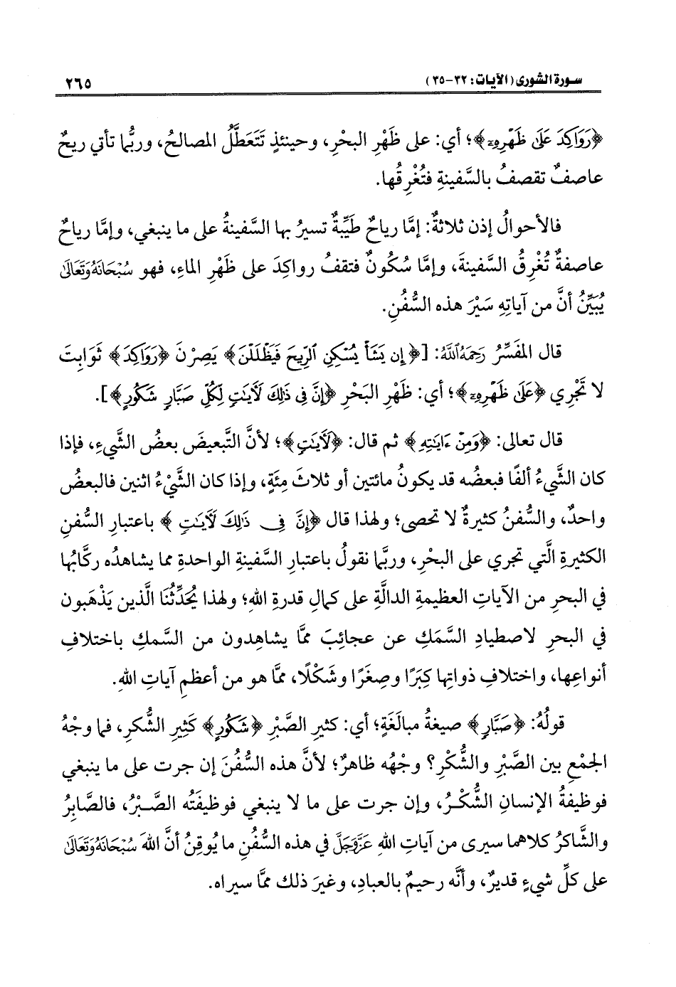 قال المفَسِّرُ رَحِمَهُ اللهُ: [{إِنْ يَشَأْ يُسْكِنِ الرِّيحَ فَيَظْلَلْنَ} يَصِرْنَ {رَوَاكِدَ} ثَوَابِتَ لا تَجْرِي {عَلَى ظَهْرِهِ}؛ أي: ظَهْرِ البَحْرِ {إِنَّ فِي ذَلِكَ لَآيَاتٍ لِكُلِّ صَبَّارٍ شَكُورٍ}].