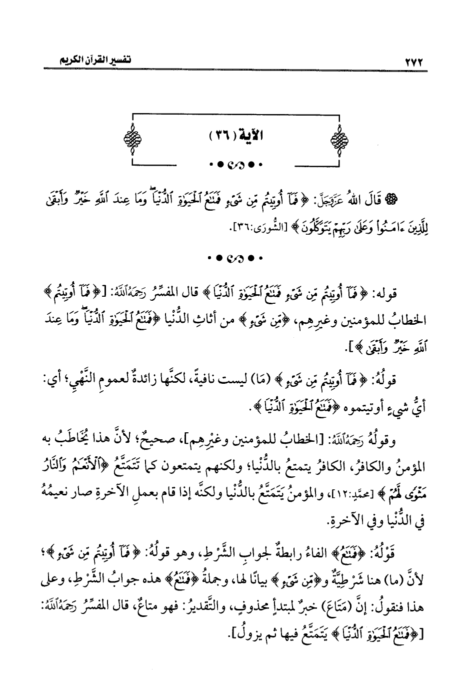 * قَالَ اللهُ عَزَّ وَجَلَّ: {فَمَا أُوتِيتُمْ مِنْ شَيْءٍ فَمَتَاعُ الْحَيَاةِ الدُّنْيَا وَمَا عِنْدَ اللَّهِ خَيْرٌ وَأَبْقَى لِلَّذِينَ آمَنُوا وَعَلَى رَبِّهِمْ يَتَوَكَّلُونَ} [الشورى: ٣٦].
