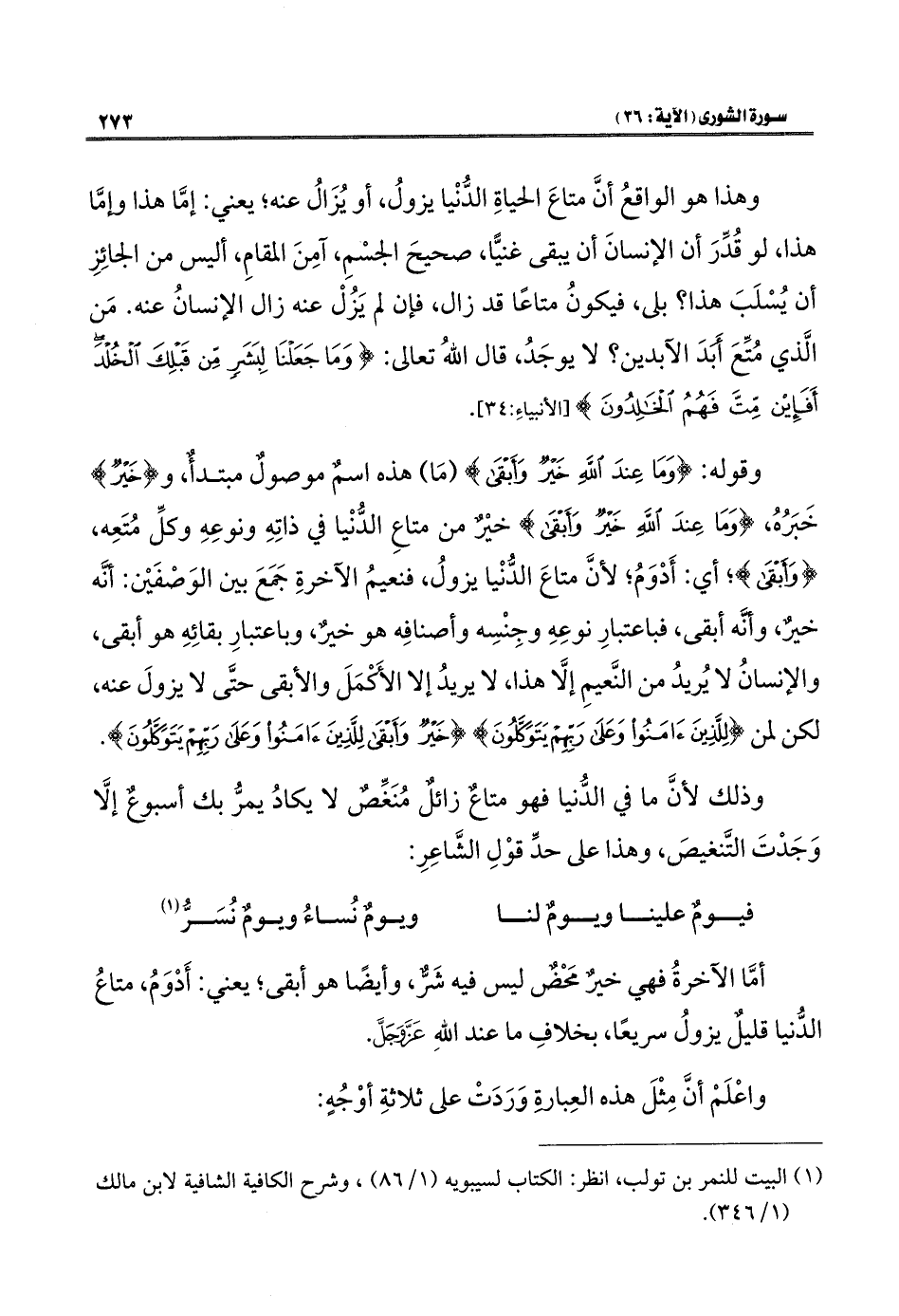 وقوله: {وَمَا عِنْدَ اللَّهِ خَيْرٌ وَأَبْقَى} (مَا) هذه اسمٌ موصولٌ مبتدأٌ، و {خَيْرٌ} خَبَرُهُ، {وَمَا عِنْدَ اللَّهِ خَيْرٌ وَأَبْقَى} خيْرٌ من متاعِ الدُّنْيا في ذاتِهِ ونوعِهِ وكلِّ مُتَعِه، {وَأَبْقَى}؛ أي: أَدْوَمُ؛ لأنَّ متاعَ الدُّنْيا يزولُ، فنعيمُ الآخرةِ جَمَعَ بين الوَصفَيْن: أنَّه خيرٌ، وأنَّه أبقى، فباعتبارِ نوعِهِ وجِنْسِه وأصنافِه هو خيرٌ، وباعتبارِ بقائِهِ هو أبقى، والإنسانُ لا يُريدُ من النَّعيمِ إلَّا هذا، لا يريدُ إلا الأَكْمَلَ والأبقى حتَّى لا يزولَ عنه، لكن لمن {لِلَّذِينَ آمَنُوا وَعَلَى رَبِّهِمْ يَتَوَكَّلُونَ} {خَيْرٌ وَأَبْقَى لِلَّذِينَ آمَنُوا وَعَلَى رَبِّهِمْ يَتَوَكَّلُونَ}.
