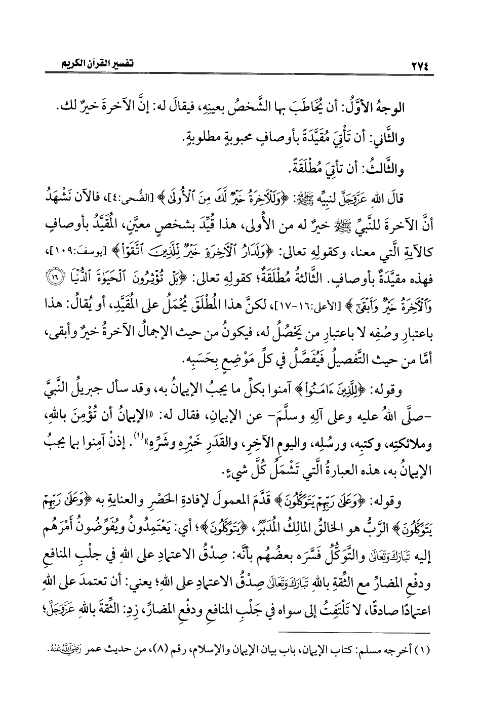 قالَ اللهِ عَزَّ وَجَلَّ لنبِيِّه - صلى الله عليه وسلم -: {وَلَلْآخِرَةُ خَيْرٌ لَكَ مِنَ الْأُولَى} [الضُّحى: ٤]، فالآن نَشْهَدُ أنَّ الآخرةَ للنَّبيِّ - صلى الله عليه وسلم - خيرٌ له من الأُولى، هذا قُيِّدَ بشخصٍ معيَّنٍ، المُقَيَّدُ بأوصافٍ كالآيةِ الَّتي معنا، وكقولِهِ تعالى: {وَلَدَارُ الْآخِرَةِ خَيْرٌ لِلَّذِينَ اتَّقَوْا} [يوسفَ: ١٠٩]، فهذه مقيَّدَةٌ بأوصافٍ. الثَّالثةُ مُطْلَقَةٌ؛ كقولِهِ تعالى: {بَلْ تُؤْثِرُونَ الْحَيَاةَ الدُّنْيَا (١٦) وَالْآخِرَةُ خَيْرٌ وَأَبْقَى} [الأعلى: ١٦ - ١٧]، لكنَّ هذا المُطْلَقَ يُحْمَلُ على المُقَيَّدِ، أو يُقالُ: هذا باعتبارِ وصْفِه لا باعتبارِ من يَحْصُلُ له، فيكونُ من حيث الإجمالُ الآخرةُ خيرٌ وأبقى، أمَّا من حيث التَّفصيلُ فَيُفَصَّلُ في كلِّ مَوْضِعٍ بِحَسَبِه.