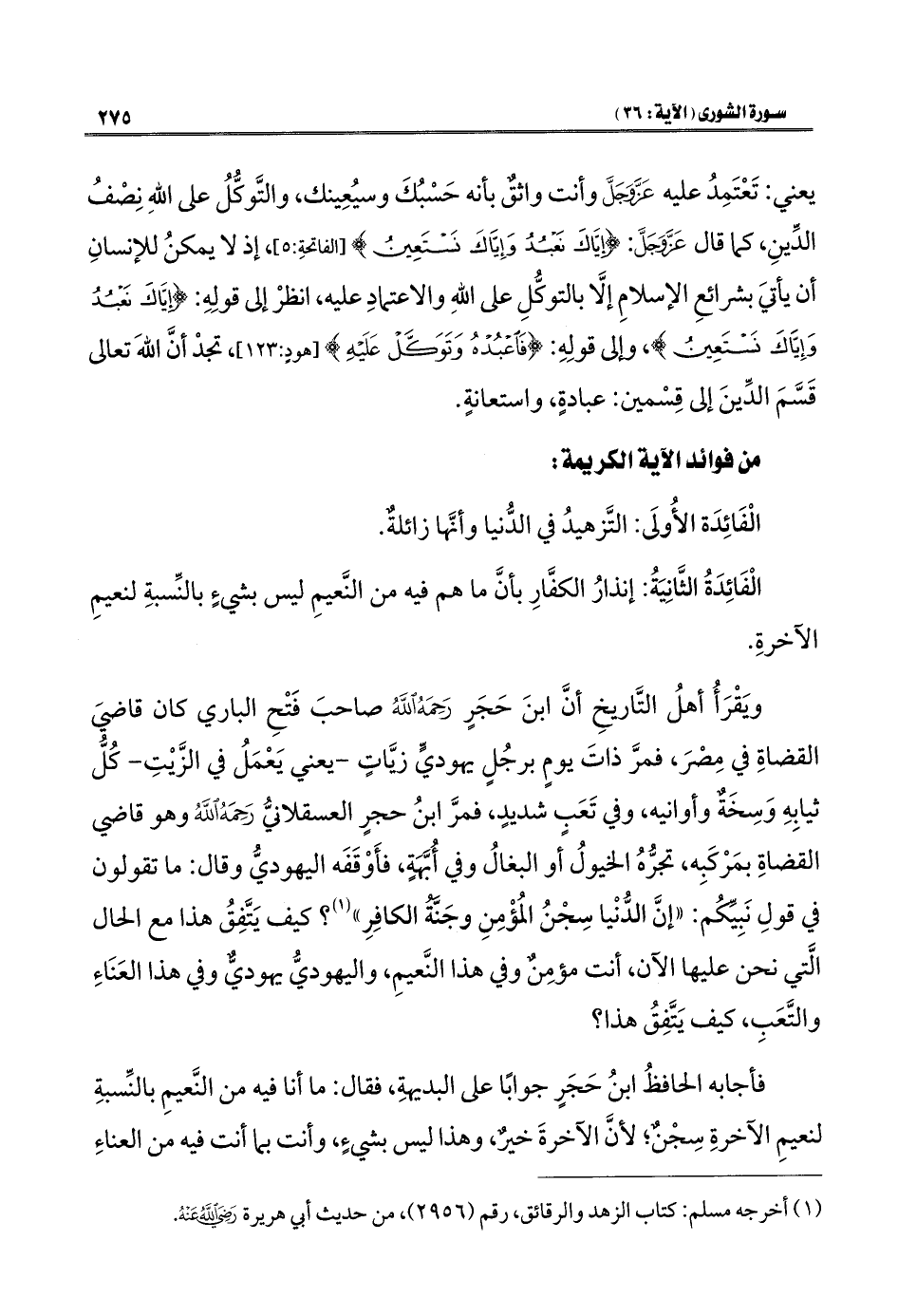 ويَقْرَأُ أهلُ التَّاريخِ أنَّ ابنَ حَجَرٍ رَحِمَهُ اللهُ صاحبَ فَتْحِ الباري كان قاضيَ القضاةِ في مِصْرَ، فمرَّ ذاتَ يومٍ برجُلٍ يهوديٍّ زيَّاتٍ - يعني يَعْمَلُ في الزَّيْتِ - كُلُّ ثيابِهِ وَسِخَةٌ وأوانيه، وفي تَعَبٍ شديدٍ، فمرَّ ابنُ حجرٍ العسقلانيُّ رَحِمَهُ اللهُ وهو قاضي القضاةِ بمَرْكَبِه، تجرُّهُ الخيولُ أو البغالُ وفي أُبَّهَةٍ، فأَوْقَفَه اليهوديُّ وقال: ما تقولون في قولِ نَبِيِّكُم: "إنَّ الدُّنْيا سِجْنُ المُؤْمِنِ وجَنَّةُ الكافِرِ" (¬١)؟ كيف يَتَّفِقُ هذا مع الحال الَّتي نحن عليها الآن، أنت مؤمِنٌ وفي هذا النَّعيمِ، واليهوديُّ يهوديٌّ وفي هذا العَنَاءِ والتَّعَبِ، كيف يَتَّفِقُ هذا؟