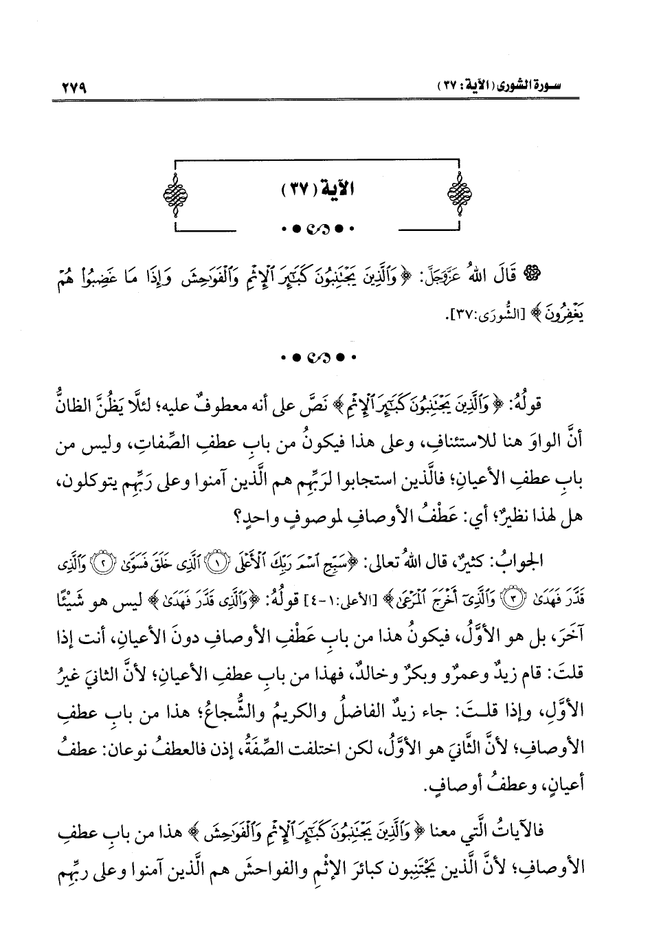 قولُهُ: {وَالَّذِينَ يَجْتَنِبُونَ كَبَائِرَ الْإِثْمِ} نَصَّ على أنه معطوفٌ عليه؛ لئلَّا يَظُنَّ الظانُّ أنَّ الواوَ هنا للإستئنافِ، وعلى هذا فيكونُ من بابِ عطفِ الصِّفاتِ، وليس من بابِ عطفِ الأعيانِ؛ فالَّذين استجابوا لرَبِّهِم هم الَّذين آمنوا وعلى رَبِّهِم يتوكلون، هل لهذا نظيرٌ؛ أي: عَطْفُ الأوصافِ لموصوفٍ واحدٍ؟