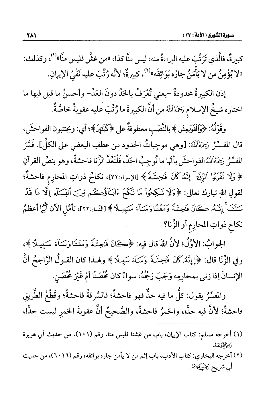 وقَوْلُهُ: {وَالْفَوَاحِشَ} بالنَّصْبِ معطوفةٌ على {كَبَائِرَ}؛ أي: ويجتنبون الفواحشَ، قال المفسِّرُ رَحِمَهُ اللهُ: [وهي موجِباتُ الحدود من عطفِ البعضِ على الكلِّ]. فَسَّرَ المفسِّرُ رَحِمَهُ اللهُ الفواحشَ بأنَّها ما تُوجِبُ الحَدَّ، فَلْنَعُدَّ الزِّنا فاحشةً، وهو بنصِّ القرآنِ {وَلَا تَقْرَبُوا الزِّنَا إِنَّهُ كَانَ فَاحِشَةً} [الإسراء: ٣٢]، نكاحُ ذواتِ المحارِمِ فاحشةٌ؛ لقولِ اللهِ تبارك تعالى: {وَلَا تَنْكِحُوا مَا نَكَحَ آبَاؤُكُمْ مِنَ النِّسَاءِ إِلَّا مَا قَدْ سَلَفَ إِنَّهُ كَانَ فَاحِشَةً وَمَقْتًا وَسَاءَ سَبِيلًا} [النِّساءِ: ٢٢]، تأمَّلِ الآن أيُّهُما أعظمُ نكاحِ ذواتِ المحارِمِ أو الزِّنا؟