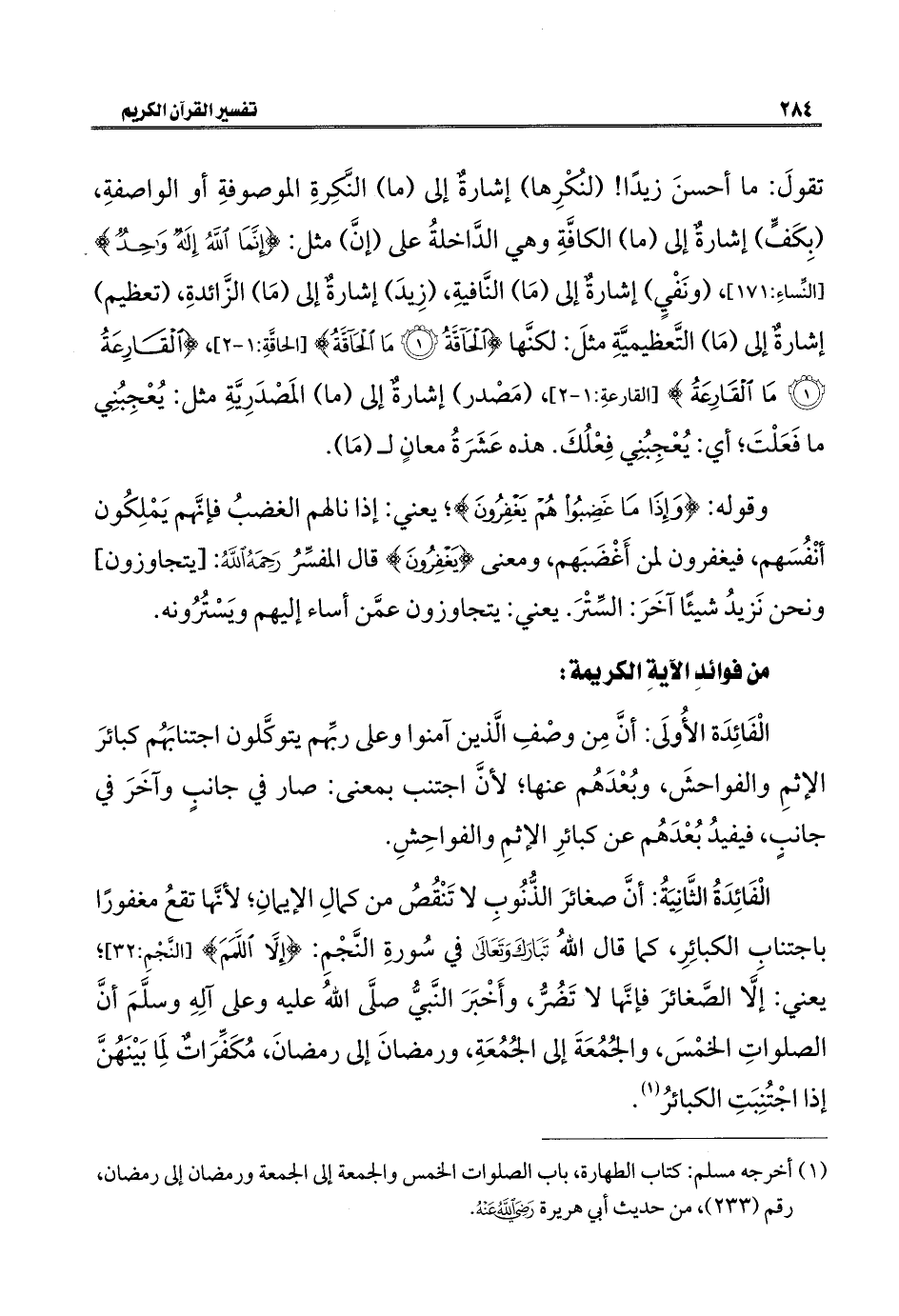 الْفَائِدَةُ الثَّانِيَةُ: أنَّ صغائرَ الذُّنُوبِ لا تَنْقُصُ من كمالِ الإيمانِ؛ لأنَّها تقعُ مغفورًا باجتناب الكبائِرِ، كما قال اللهُ تَبَارَكَ وَتَعَالَى في سُورةِ النَّجْمِ: {إِلَّا اللَّمَمَ} [النَجْمِ: ٣٢]؛ يعني: إلَّا الصَّغائرَ فإنَّها لا تَضُرُّ، وأَخْبَرَ النَّبيُّ صلَّى اللهُ عليه وعلى آلِهِ وسلَّمَ أنَّ الصلواتِ الخمْسَ، والجُمُعَةَ إلى الجُمُعَةِ، ورمضانَ إلى رمضانَ، مُكَفِّرَاتٌ لمِا بَيْنَهُنَّ إذا اجْتُنِبَتِ الكبائرُ (¬١).