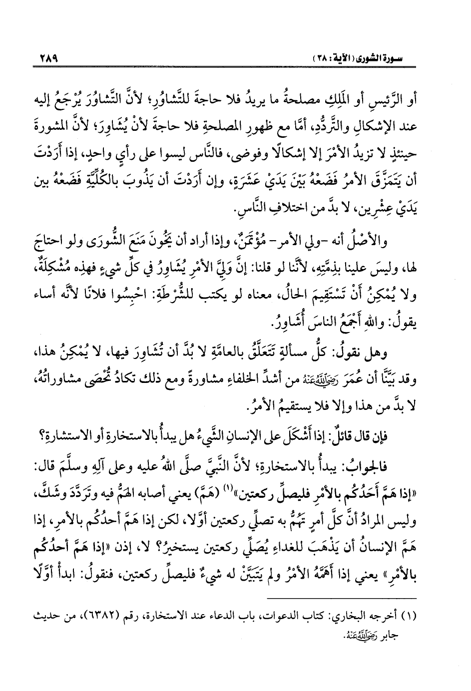 والأصْلُ أنه - ولي الأمر- مُؤْتَمَنٌ، وإذا أراد أن يَخُونَ مَنَعَ الشُّورَى ولو احتاجَ لها، وليسَ علينا بذِمَّتِهِ، لأنَّنا لو قلنا: إنَّ وَلِيَّ الأمْرِ يُشَاوِرُ في كلِّ شيءٍ فهذِه مُشْكِلَةٌ، ولا يُمْكِنُ أَنْ تَسْتَقِيمَ الحالُ، معناه لو يكتب للشُّرْطَةِ: احْبِسُوا فلانًا لأنَّه أساء يقولُ: واللهِ أَجْمَعُ الناسَ أُشَاوِرُ.