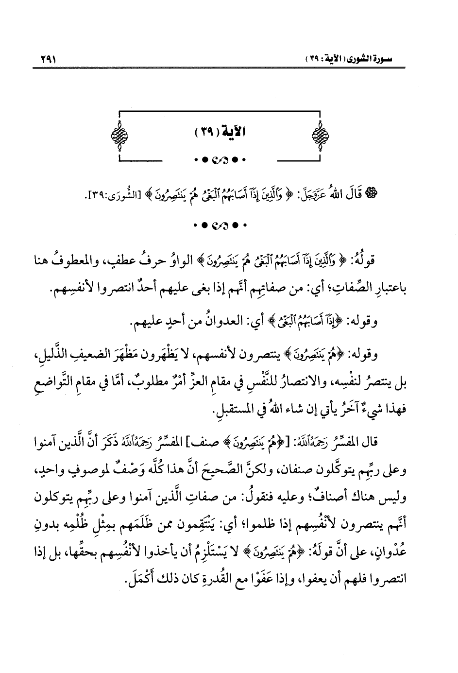 قال المفسِّرُ رَحِمَهُ اللهُ: [{هُمْ يَنْتَصِرُونَ} صنف] المفسِّرُ رَحِمَهُ اللهُ ذَكَرَ أنَّ الَّذين آمنوا وعلى ربِّهِم يتوكَّلون صنفان، ولكنَّ الصَّحيحَ أنَّ هذا كُلَّه وَصْفٌ لموصوفٍ واحدٍ، وليس هناك أصنافٌ؛ وعليه فنقولُ: من صفاتِ الَّذين آمنوا وعلى ربِّهِم يتوكلون أنَّهم ينتصرون لأنْفُسِهم إذا ظلموا؛ أي: يَنْتَقِمون ممن ظَلَمَهم بمِثْلِ ظُلْمِه بدونِ عُدْوانٍ، على أنَّ قولَهُ: {هُمْ يَنْتَصِرُونَ} لا يَسْتَلْزِمُ أن يأخذوا لأنْفُسِهم بحقِّها، بل إذا انتصروا فلهم أن يعفوا، وإذا عَفَوْا مع القُدرةِ كان ذلك أَكْمَلَ.