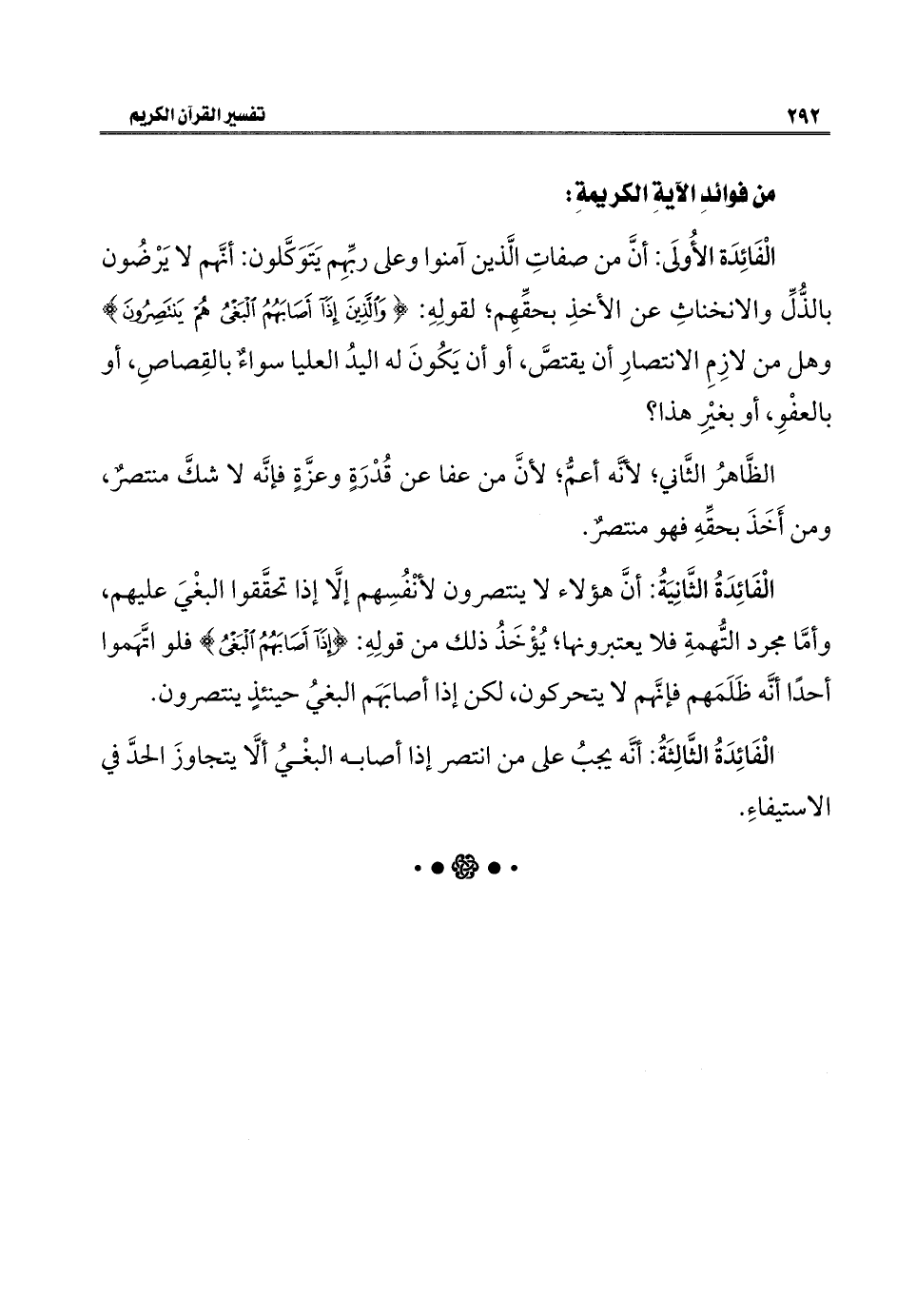 الْفَائِدَة الأُولَى: أنَّ من صفاتِ الَّذين آمنوا وعلى ربِّهِم يَتَوَكَّلون: أنَّهم لا يَرْضُون بالذُّلِّ والإنخناثِ عن الأخذِ بحقِّهِم؛ لقولِهِ: {وَالَّذِينَ إِذَا أَصَابَهُمُ الْبَغْيُ هُمْ يَنْتَصِرُونَ} وهل من لازِمِ الإنتصارِ أن يقتصَّ، أو أن يَكُونَ له اليدُ العليا سواءٌ بالقِصاصِ، أو بالعفْوِ، أو بغيْرِ هذا؟