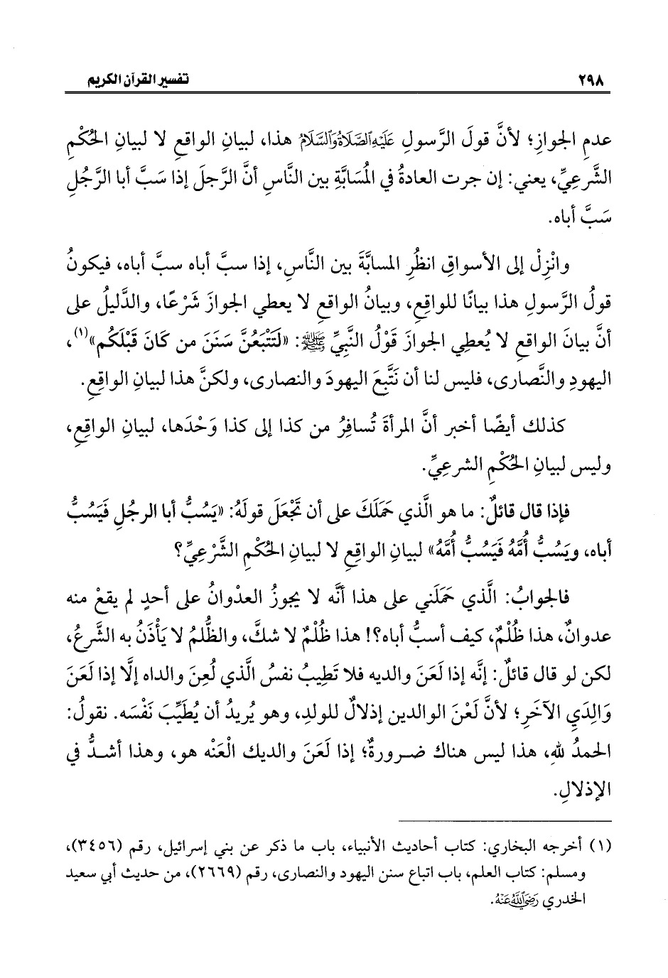 وانْزِلْ إلى الأسواقِ انظُرِ المسابَّةَ بين النَّاسِ، إذا سبَّ أباه سبَّ أباه، فيكونُ قولُ الرَّسولِ هذا بيانًا للواقِعِ، وبيانُ الواقعِ لا يعطي الجوازَ شَرْعًا، والدَّليلُ على أنَّ بيانَ الواقعِ لا يُعطِي الجوازَ قَوْلُ النَّبِيِّ - صلى الله عليه وسلم -: "لَتَتْبَعُنَّ سَنَنَ من كَانَ قَبْلَكُم" (¬١)، اليهودِ والنَّصارى، فليس لنا أن نَتَّبعَ اليهودَ والنصارى، ولكنَّ هذا لبيانِ الواقِعِ.