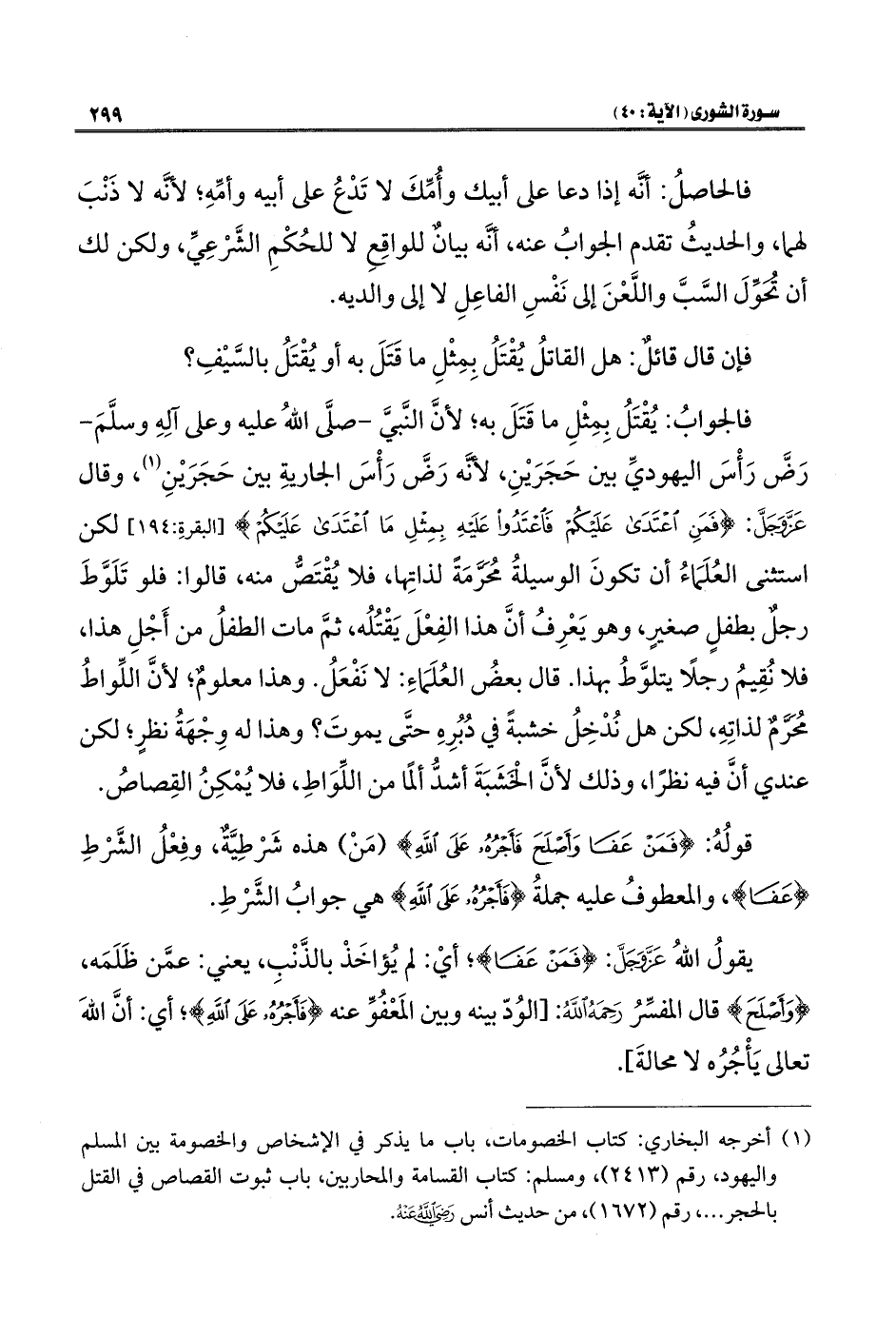يقولُ اللهُ عَزَّ وَجَلَّ: {فَمَنْ عَفَا}؛ أيْ: لم يُؤاخَذْ بالذَّنْبِ، يعني: عمَّن ظَلَمَه، {وَأَصْلَحَ} قال المفسِّرُ رَحِمَهُ اللهُ: [الوُدّ بينه وبين المَعْفُوِّ عنه {فَأَجْرُهُ عَلَى اللَّهِ}؛ أي: أنَّ اللهَ تعالى يَأجُرُه لا محالةَ].