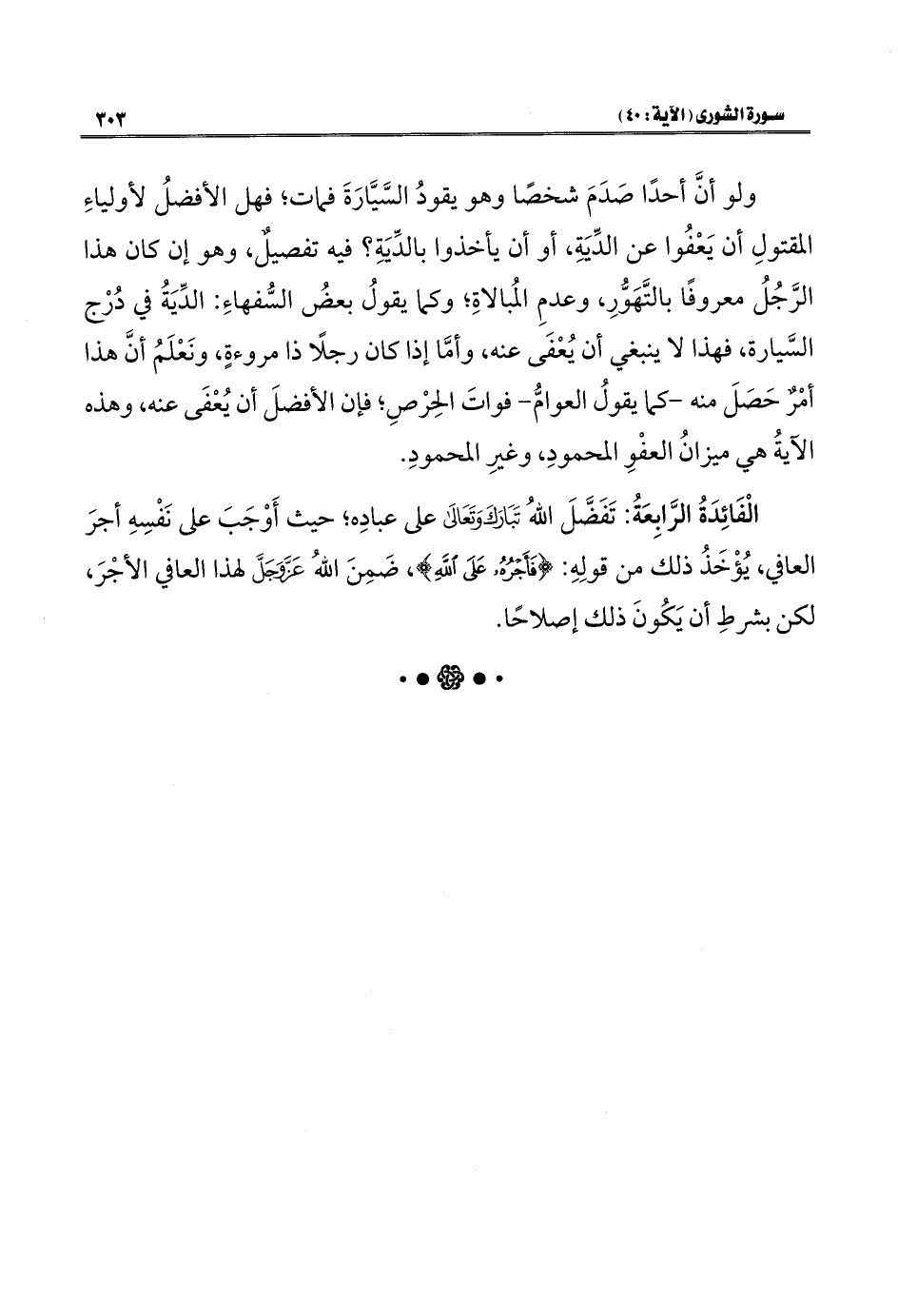 ولو أنَّ أحدًا صَدَمَ شخصًا وهو يقودُ السَّيَّارَةَ فمات؛ فهل الأفضلُ لأولياءِ المقتولِ أن يَعْفُوا عن الدِّيَةِ، أو أن يأخذوا بالدِّيَةِ؟ فيه تفصيلٌ، وهو إن كان هذا الرَّجُلُ معروفًا بالتَّهَوُّرِ، وعدمِ المُبالاةِ؛ وكما يقولُ بعضُ السُّفهاءِ: الدِّيَةُ في دُرْج السَّيارة، فهذا لا ينبغي أن يُعْفَى عنه، وأمَّا إذا كان رجلًا ذا مروءةٍ، ونَعْلَمُ أنَّ هذا أمْرٌ حَصَلَ منه - كما يقولُ العوامُّ - فواتَ الحِرْصِ؛ فإن الأفضلَ أن يُعْفَى عنه، وهذه الآيةُ هي ميزانُ العفْوِ المحمودِ، وغيرِ المحمودِ.