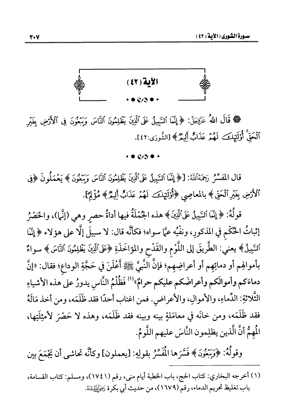قال المفسِّرُ رَحِمَهُ اللَّهُ: [{إِنَّمَا السَّبِيلُ عَلَى الَّذِينَ يَظْلِمُونَ النَّاسَ وَيَبْغُونَ} يَعْمَلُونَ {فِي الْأَرْضِ بِغَيْرِ الْحَقِّ} بالمعاصِي {أُولَئِكَ لَهُمْ عَذَابٌ أَلِيمٌ} مُؤْلِمٌ].