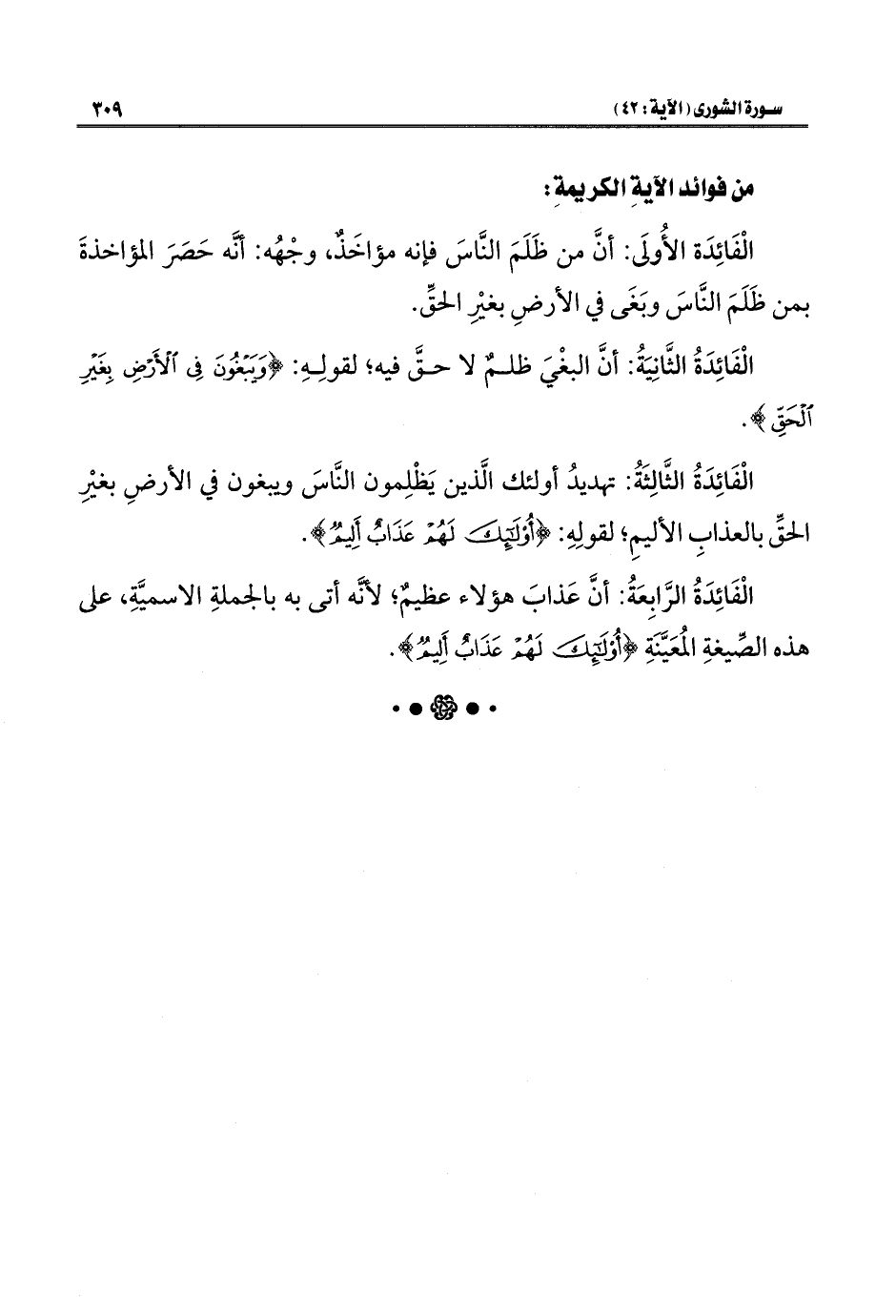 الْفَائِدَة الأُولَى: أنَّ من ظَلَمَ النَّاسَ فإنه مؤاخَذٌ، وجْهُه: أَنَّه حَصَرَ المؤاخذةَ بمن ظَلَمَ النَّاسَ وبَغَى في الأرضِ بغيْرِ الحقِّ.
