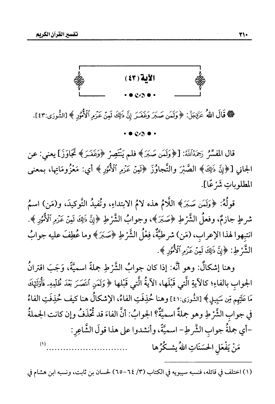 وهنا إشكالٌ: وهو أنَّه: إذا كان جوابُ الشَّرْطِ جملةً اسميَّةً، وَجَبَ اقترانُ الجوابِ بالفاءِ، كالآيةِ الَّتي قَبْلَها، الآيةُ الَّتي قَبْلها {وَلَمَنِ انْتَصَرَ بَعْدَ ظُلْمِهِ فَأُوْلَئِكَ مَا عَلَيْهِمْ مِنْ سَبِيلٍ} [الشُّورَى: ٤١]، وهنا حُذِفَتِ الفاءُ، الإشكالُ هنا كيف حُذِفَتِ الفاءُ في جوابِ الشَّرْطِ وهو جملةٌ اسميَّةٌ؟ الجوابُ: أنَّ الفاءَ قد تُحْذَفُ وإن كانت الجملةُ - أي جملةُ جوابِ الشَّرطِ - اسميَّةً، وأنشدوا على هذا قولَ الشَّاعِرِ: