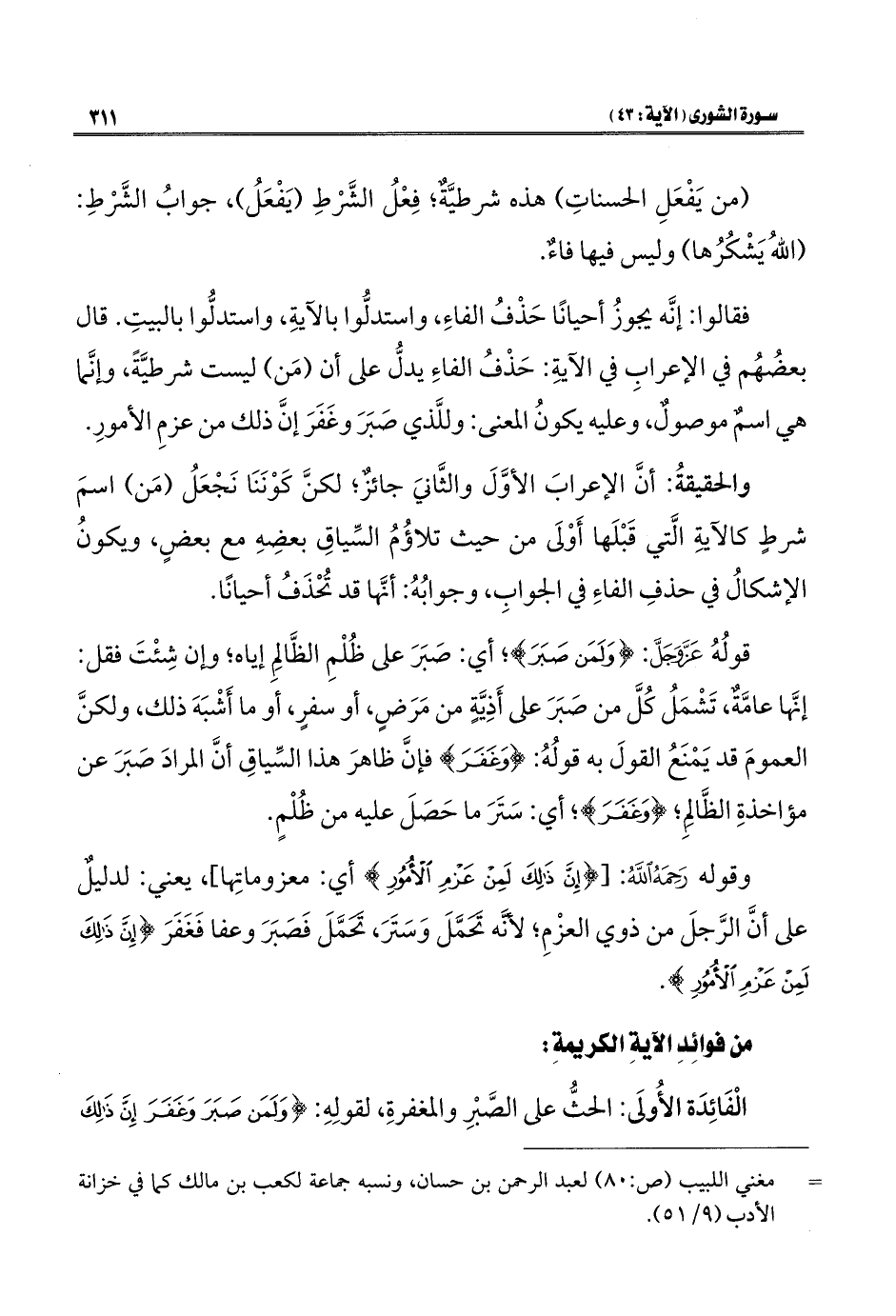 فقالوا: إنَّه يجوزُ أحيانًا حَذْفُ الفاءِ، واستدلُّوا بالآيةِ، واستدلُّوا بالبيتِ. قال بعضُهُم في الإعرابِ في الآيةِ: حَذْفُ الفاءِ يدلُّ على أن (مَن) ليست شرطيَّةً، وإنَّما هي اسمٌ موصولٌ، وعليه يكونُ المعنى: وللَّذي صَبَرَ وغَفَرَ إنَّ ذلك من عزمِ الأمورِ.