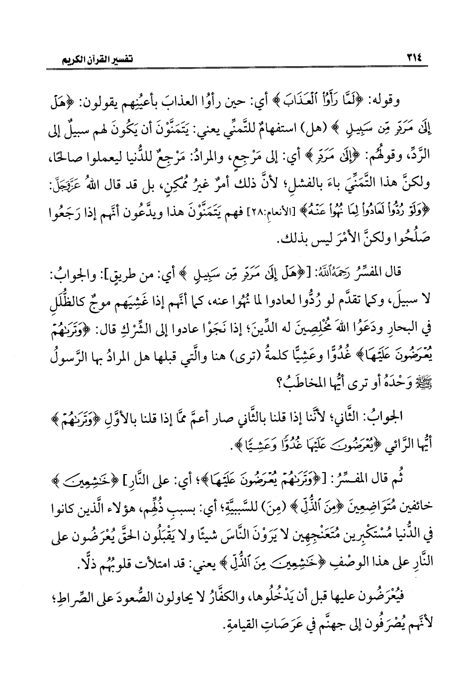 قال المفسِّرُ رَحِمَهُ اللَّهُ: [{هَلْ إِلَى مَرَدٍّ مِنْ سَبِيلٍ} أي: من طريقٍ]: والجوابُ: لا سبيلَ، وكما تقدَّم لو رُدُّوا لعادوا لما نُهُوا عنه، كما أنَّهم إذا غَشِيَهم موجٌ كالظُّلَلِ في البحارِ ودَعَوُا اللهَ مُخْلِصِينَ له الدِّينَ؛ إذا نَجَوْا عادوا إلى الشِّرْكِ قال: {وَتَرَاهُمْ يُعْرَضُونَ عَلَيْهَا} غُدُوًّا وعَشِيًّا كلمةُ (ترى) هنا والَّتي قبلها هل المرادُ بها الرَّسولُ - صلى الله عليه وسلم - وَحْدَهُ أو ترى أيُّها المخاطَبُ؟