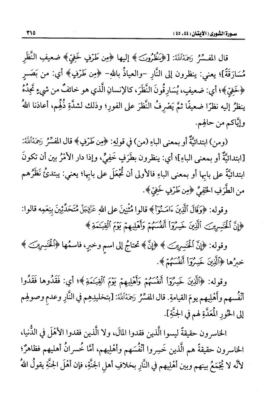 قال المفسِّرُ رَحِمَهُ اللَّهُ: [{يَنْظُرُونَ} إليها {مِنْ طَرْفٍ خَفِيٍّ} ضعيفِ النَّظَرِ مُسَارَقَةً]؛ يعني: ينظرون إلى النَّارِ - والعياذُ باللهِ - {مِنْ طَرْفٍ} أي: من بَصَرٍ {خَفِيٍّ}؛ أي: ضعيفٍ، يُسَارِقُونَ النَّظَرَ، كالإنسانِ الَّذي هو خائفٌ من شيءٍ تَجِدُهُ ينظرُ إليه نظرًا ضعيفًا ثمَّ يَصْرِفُ النَّظرَ على الفورِ؛ وذلك لشدَّةِ ذُلِّهِم، أعاذنا اللهُ وإيَّاكم من حالهِم.