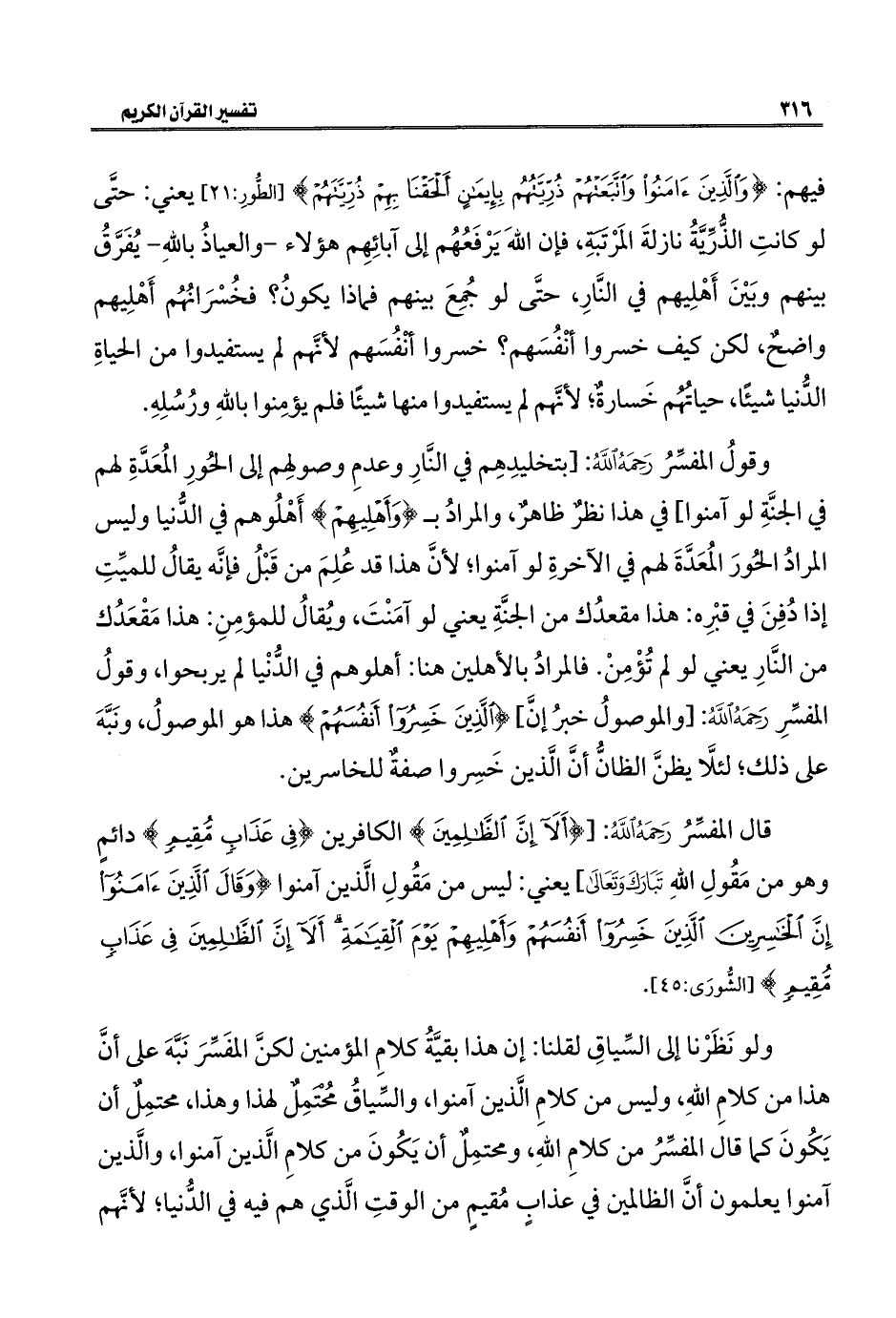 فيهم: {وَالَّذِينَ آمَنُوا وَاتَّبَعَتْهُمْ ذُرِّيَّتُهُمْ بِإِيمَانٍ أَلْحَقْنَا بِهِمْ ذُرِّيَّتَهُمْ} [الطُّورِ: ٢١]، يعني: حتَّى لو كانتِ الذُّرِّيَّةُ نازلةَ المَرْتَبَةِ، فإن اللهَ يَرْفَعُهُم إلى آبائِهِم هؤلاء - والعياذُ باللهِ - يُفَرَّقُ بينهم وبَيْنَ أَهْلِيهم في النَّارِ، حتَّى لو جُمِعَ بينهم فماذا يكونُ؟ فخُسْرَانُهُم أَهْلِيهم واضحٌ، لكن كيف خسروا أنْفُسَهم؟ خسروا أنْفُسَهم لأنَّهم لم يستفيدوا من الحياةِ الدُّنيا شيئًا، حياتهم خَسارةٌ؛ لأنَّهم لم يستفيدوا منها شيئًا فلم يؤمِنوا باللهِ ورُسُلِهِ.