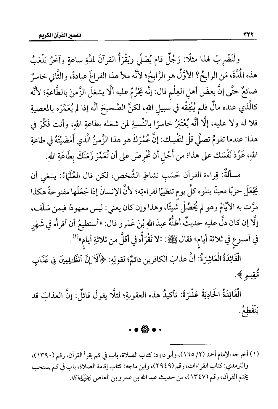 مسألةٌ: قِراءة القرآن حَسَبِ نشاطِ الشَّخص، لكن قال العُلَمَاءُ: ينبغي أن يَجْعَلَ حزبًا معينًا يتلوه كلَّ يومٍ تنظيمًا لقراءتِه؛ لأنَّ الإنسانَ إذا جَعَلَها مفتوحةً هكذا مرَّت به الأَيَّامُ وهو لم يُحَصِّلْ شيئًا، وهذا وإن كان يعني: ليس معهودًا فيمن سَلَف، إلَّا إن كان دلَّ عليه حديثٌ أظنُّهُ عبدَ اللهِ بْنَ عَمْرو قال: "أستطيعُ أن أقرأَه في شَهْرٍ في أسبوعٍ في ثلاثة أيامٍ" فقال - صلى الله عليه وسلم -: "لا تَقْرَأْه في أقلَّ من ثلاثةِ أيامٍ" (¬١).