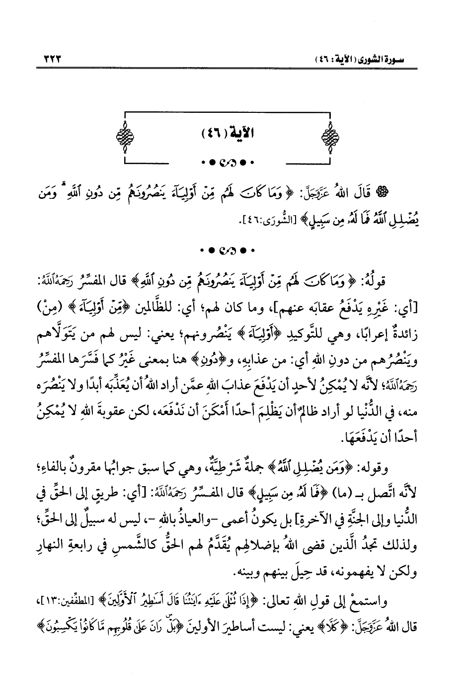 قولُهُ: {وَمَا كَانَ لَهُمْ مِنْ أَوْلِيَاءَ يَنْصُرُونَهُمْ مِنْ دُونِ اللَّهِ} قال المفسِّرُ رَحِمَهُ اللَّهُ: [أي: غَيْرِهِ يَدْفَعُ عقابَه عنهم]، وما كان لهم؛ أي: للظَّالمين {مِنْ أَوْلِيَاءَ} (مِنْ) زائدةٌ إعرابًا، وهي للتَّوكيدِ {أَوْلِيَاءَ} يَنْصُرونهم؛ يعني: ليس لهم من يَتَوَلَّاهم وَينْصُرُهم من دونِ اللهِ أي: من عذابِهِ، و {دُونِ} هنا بمعنى غَيْرُ كما فَسَّرَها المفسِّرُ رَحِمَهُ اللَّهُ؛ لأنَّه لا يُمْكِنُ لأحدٍ أن يَدْفَعَ عذابَ اللهِ عمَّن أراد اللهُ أن يُعَذِّبَه أبدًا ولا يَنْصُرَه منه، في الدُّنْيا لو أراد ظالمٌ أن يَظْلِمَ أحدًا أَمْكَنَ أن نَدْفَعَه، لكن عقوبةَ اللهِ لا يُمْكِنُ أحدًا أن يَدْفَعَهَا.