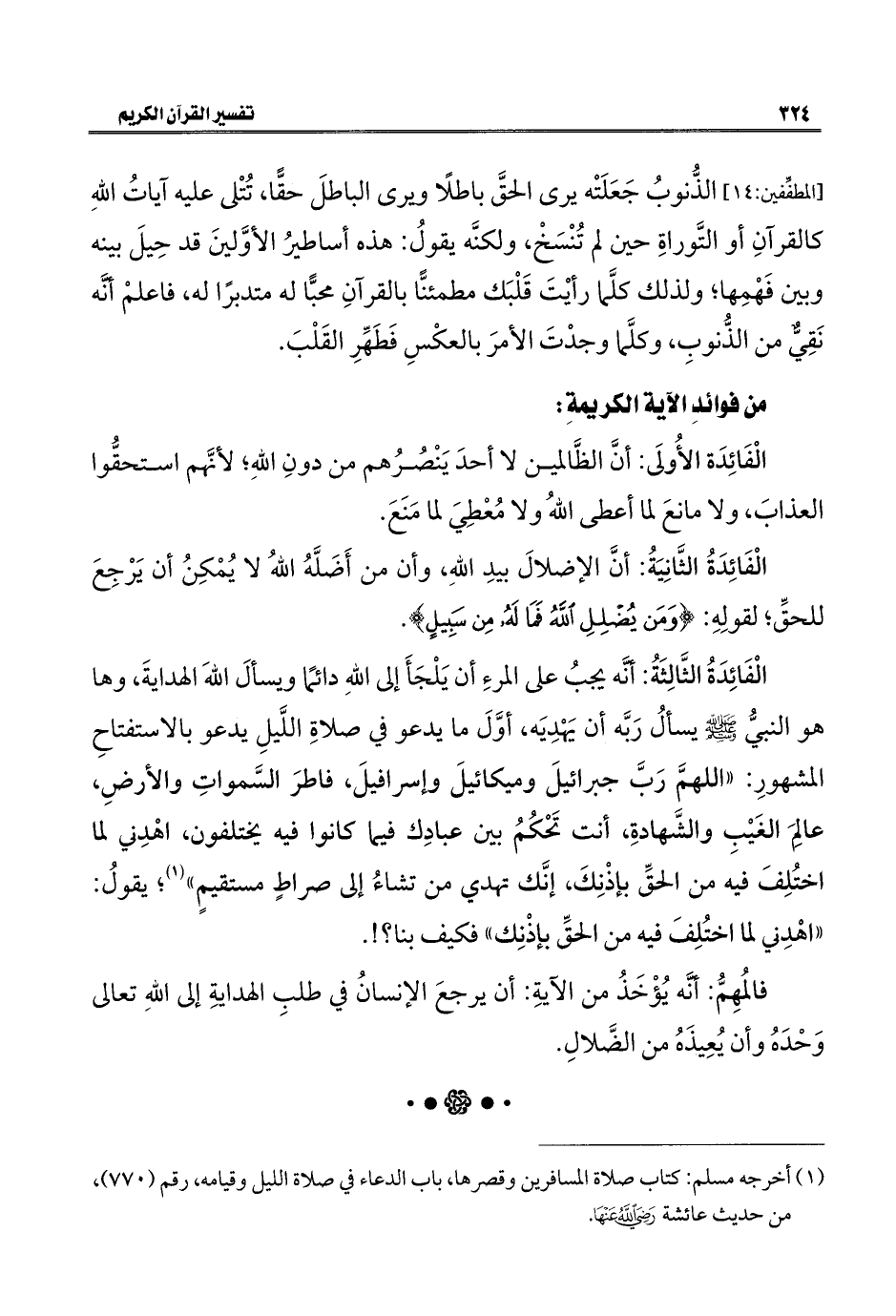 الْفَائِدَةُ الثَّالِثَةُ: أنَّه يجبُ على المرءِ أن يَلْجَأَ إلى اللهِ دائمًا ويسألَ اللهَ الهدايةَ، وها هو النبيُّ - صلى الله عليه وسلم - يسألُ رَبَّه أن يَهْدِيَه، أوَّلَ ما يدعو في صلاةِ اللَّيلِ يدعو بالإستفتاحِ المشهورِ: "اللهمَّ رَبَّ جبرائيلَ وميكائيلَ وإسرافيلَ، فاطرَ السَّمواتِ والأرضِ، عالِمَ الغَيْبِ والشَّهادةِ، أنت تَحْكُمُ بين عبادِك فيما كانوا فيه يختلفون، اهْدِني لما اختُلِفَ فيه من الحقِّ بإذْنِكَ، إنَّك تهدي من تشاءُ إلى صراطٍ مستقيمٍ" (¬١)؛ يقولُ: "اهْدِني لما اختُلِفَ فيه من الحقِّ بإذْنِك" فكيف بنا؟ ! .