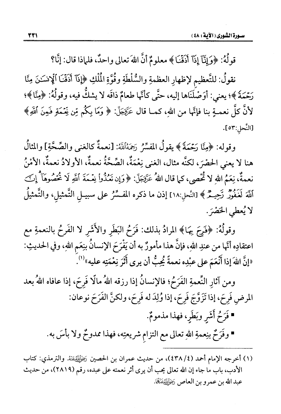 * وفَرَحٌ بنِعمةِ اللهِ تعالى مع التزامِ شريعتِه، فهذا ممدوحٌ ولا بأسَ به.