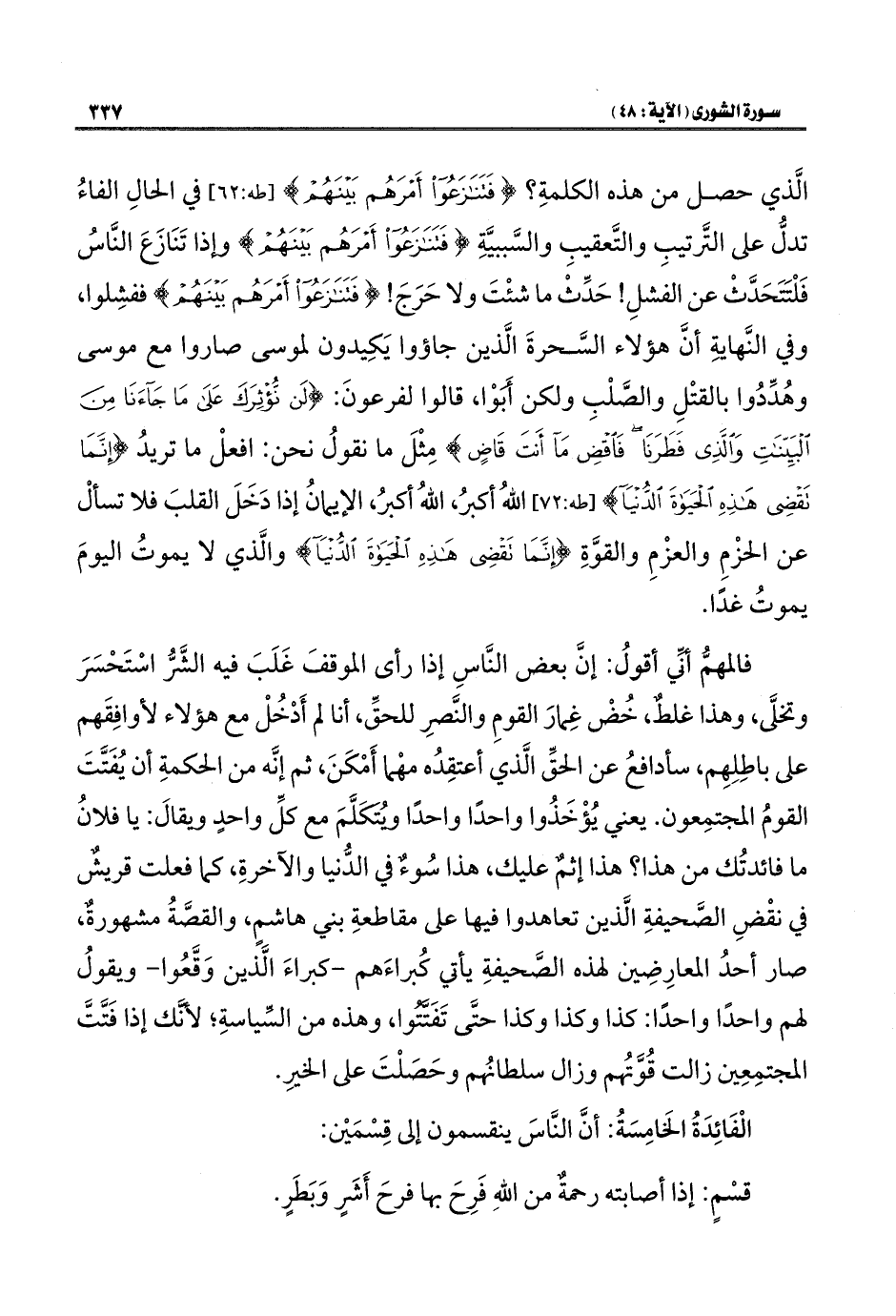 الَّذي حصل من هذه الكلمةِ؟ {فَتَنَازَعُوا أَمْرَهُمْ بَيْنَهُمْ} [طه: ٦٢] في الحالِ الفاءُ تدلُّ على التَّرتيبِ والتَّعقيبِ والسّببيَّةِ {فَتَنَازَعُوا أَمْرَهُمْ بَيْنَهُمْ} وإذا تَنَازَعَ النّاسُ فَلْتَتَحَدَّثْ عن الفشلِ! حَدِّثْ ما شئْتَ ولا حَرَجَ! {فَتَنَازَعُوا أَمْرَهُمْ بَيْنَهُمْ} ففشِلوا، وفي النَّهايةِ أنَّ هؤلاء السَّحرةَ الَّذين جاؤوا يَكِيدون لموسى صاروا مع موسى وهُدِّدُوا بالقتْلِ والصَّلْبِ ولكن أَبَوْا، قالوا لفرعونَ: {قَالُوا لَنْ نُؤْثِرَكَ عَلَى مَا جَاءَنَا مِنَ الْبَيِّنَاتِ وَالَّذِي فَطَرَنَا فَاقْضِ مَا أَنْتَ قَاضٍ} مِثْلَ ما نقولُ نحن: افعلْ ما تريدُ {إِنَّمَا تَقْضِي هَذِهِ الْحَيَاةَ الدُّنْيَا} [طه: ٧٢]، اللهُ أكبرُ، اللهُ أكبرُ، الإيمانُ إذا دَخَلَ القلبَ فلا تسألْ عن الحزْمِ والعزْمِ والقوَّةِ {إِنَّمَا تَقْضِي هَذِهِ الْحَيَاةَ الدُّنْيَا} والَّذي لا يموتُ اليومَ يموتُ غدًا.