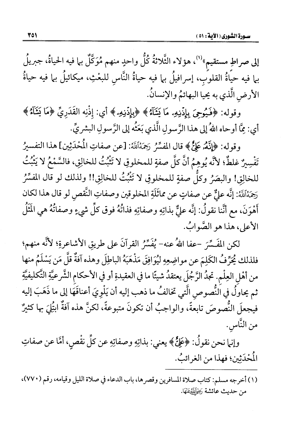 وقوله: {إِنَّهُ عَلِيٌّ} قال المفسِّرُ رَحِمَهُ اللَّهُ: [عن صفاتِ المُحْدَثِين] هذا التفسيرُ تَفْسِيرٌ غلطٌ؛ لأنَّه يُوهِمُ أنَّ كلَّ صفةٍ للمخلوقِ لا تَثْبُتُ للخالِقِ، فالسَّمْعُ لا يَثْبُتُ للخالِقِ! والبصَرُ وكلُّ صفةٍ للمخلوقِ لا تَثْبُتُ للخالِقِ! ! ولذلك لو قال المفسِّرُ رَحِمَهُ اللَّهُ: إنَّه عليٌّ عن صفاتٍ عن مماثَلَةِ المخلوقين وصفاتِ النَّقصِ لو قال هذا لكان أَهْوَنَ، مع أنَّنا نقولُ: إنَّه عليٌّ بذاتِهِ وصفاتِهِ فذاتُهُ فوق كلِّ شيءٍ وصفاتُهُ هي المَثَلُ الأعلى، هذا هو الصَّوابُ.