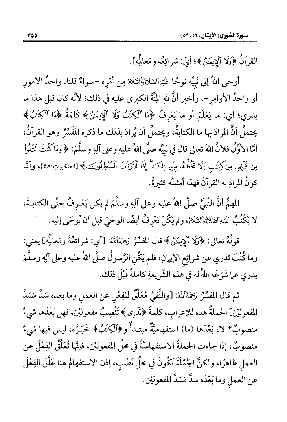 ثم قال المفسِّرُ رَحِمَهُ اللهُ: [والنَّفيُ مُعَلِّقٌ للفِعْلِ عن العملِ وما بعده سَدَّ مَسَدَّ المفعوليْن] الجملةُ هذه للإعرابِ، كلمةُ {تَدْرِي} تَنْصِبُ مفعوليْن، فهل بَعْدَها شيءٌ منصوبٌ؟ لا، بَعْدَها (ما) استفهاميَّةٌ مبتدأٌ و {الْكِتَابُ} خَبَرُه، ليس فيها شيءٌ منصوبٌ، إذا جاءتِ الجملةُ الإستفهاميَّةُ في محلِّ المفعوليْن، فإنَّها تُعَلِّقُ الفِعْلَ عن العملِ ظاهرًا، ولكنَّ الجُمْلَةَ تَكُونُ في محلِّ نَصْبٍ، إذن الإستفهامُ هنا عَلَّقَ الفِعْلَ عن العملِ وما بَعْدَه سدَّ مَسَدَّ المفعوليْن.