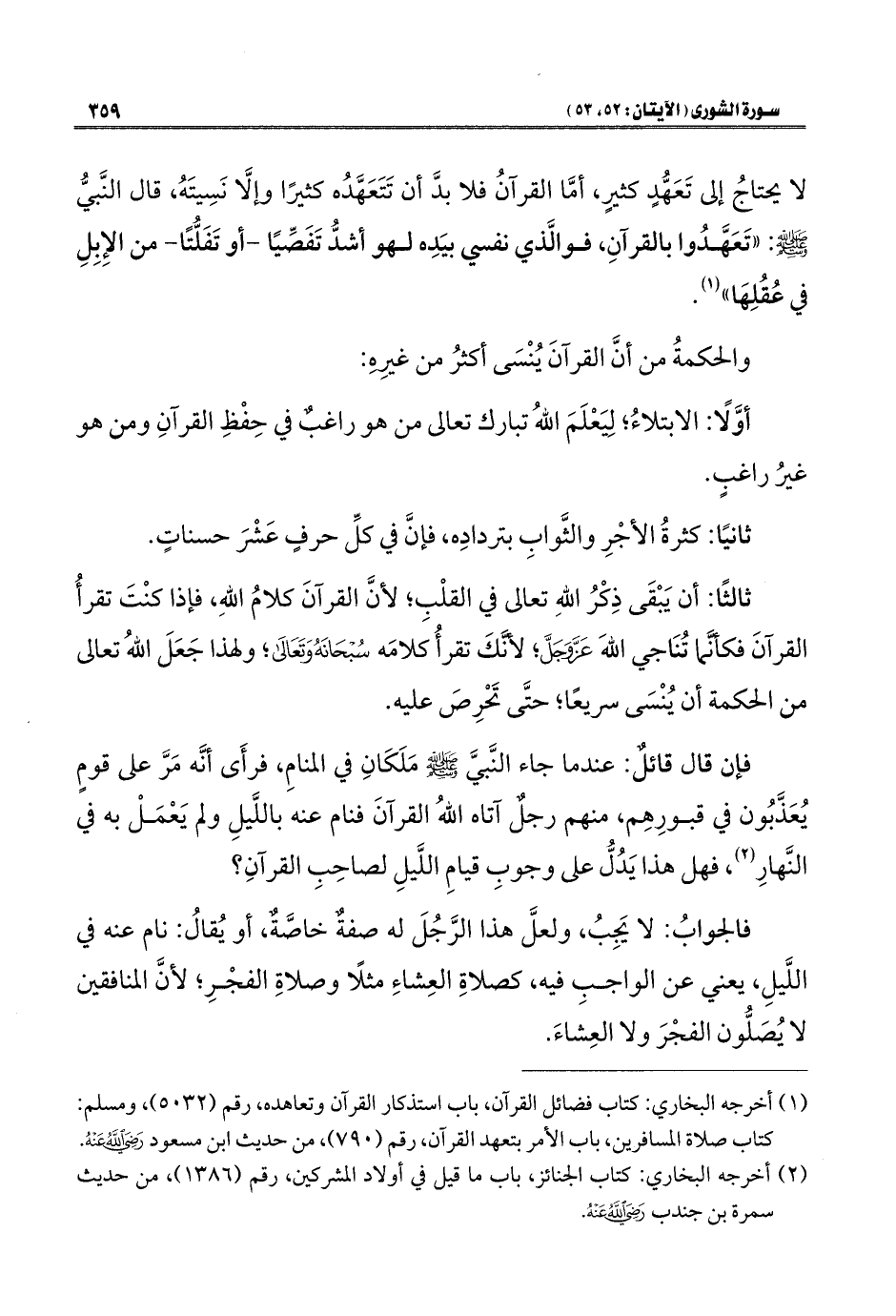 لا يحتاجُ إلى تَعَهُّدٍ كثيرٍ، أمَّا القرآنُ فلا بدَّ أن تَتَعَهَّدُه كثيرًا وإلَّا نَسِيتَهُ، قال النَّبيُّ - صلى الله عليه وسلم -: "تَعَهَّدُوا بالقرآنِ، فوالَّذي نفسي بيَدِهِ لهو أشدُّ تَفَصِّيًا - أو تَفَلُّتًا - من الإبِلِ في عُقُلِهَا" (¬١).