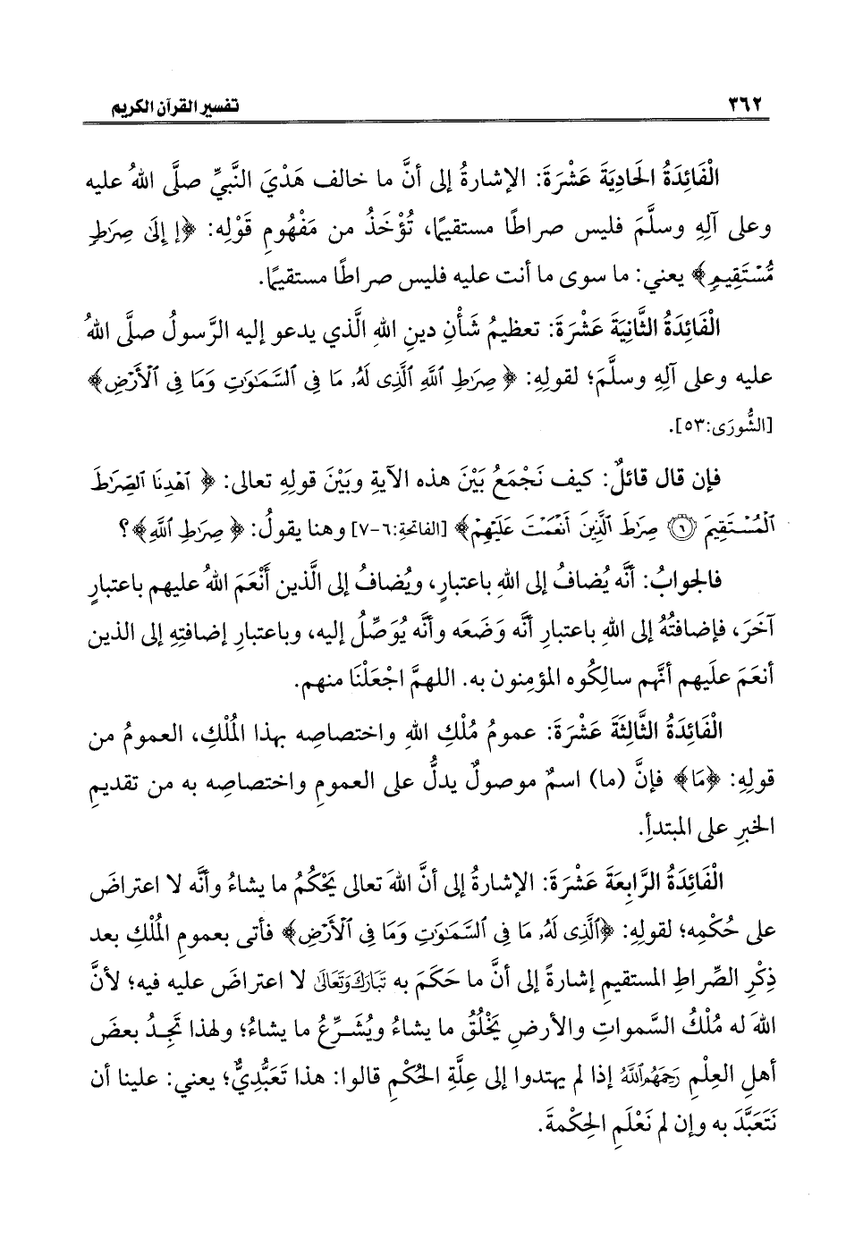 الْفَائِدَةُ الرَّابِعَةَ عَشْرَةَ: الإشارةُ إلى أنَّ اللهَ تعالى يَحْكُمُ ما يشاءُ وأنَّه لا اعتراضَ على حُكْمِه؛ لقولِهِ: {الَّذِي لَهُ مَا فِي السَّمَاوَاتِ وَمَا فِي الْأَرْضِ} فأتى بعمومِ المُلْكِ بعد ذِكْرِ الصِّراطِ المستقيمِ إشارةً إلى أنَّ ما حَكَمَ به تَبَارَكَ وَتَعَالَى لا اعتراضَ عليه فيه؛ لأنَّ اللهَ له مُلْكُ السَّمواتِ والأرضِ يَخْلُقُ ما يشاءُ ويُشَرِّعُ ما يشاءُ؛ ولهذا تَجِدُ بعضَ أهلِ العِلْمِ رَحِمَهُم اللهُ إذا لم يهتدوا إلى عِلَّةِ الحُكْمِ قالوا: هذا تَعَبُّدِيٌّ؛ يعني: علينا أن نَتَعَبَّدَ به وإن لم نَعْلَمِ الحِكْمةَ.