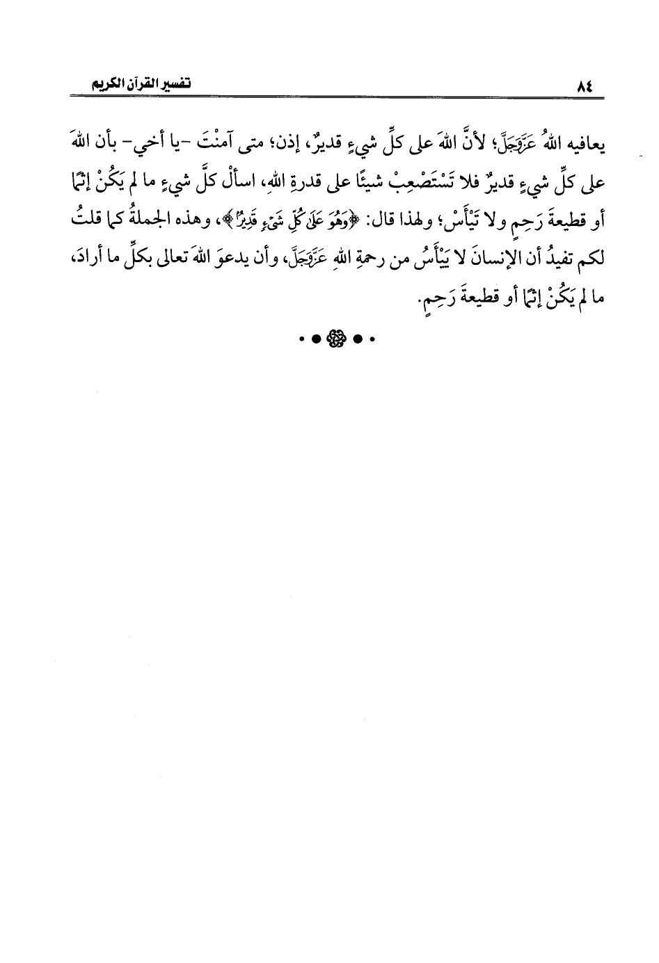 يعافيه اللهُ عَزَّ وَجَلَّ؛ لأنَّ اللهَ على كلِّ شيءٍ قديرٌ، إذن؛ متى آمنْتَ - يا أخي - بأن اللهَ على كلِّ شيءٍ قديرٌ فلا تَسْتَصْعِبْ شيئًا على قدرةِ اللهِ، اسألْ كلَّ شيءٍ ما لم يَكُنْ إثمًا أو قطيعةَ رَحِمٍ ولا تَيْأَسْ؛ ولهذا قال: {وَهُوَ عَلَى كُلِّ شَيْءٍ قَدِيرٌ}، وهذه الجملةُ كما قلتُ لكم تفيدُ أن الإنسانَ لا يَيْأَسُ من رحمةِ اللهِ عَزَّ وَجَلَّ، وأن يدعوَ اللهَ تعالى بكلِّ ما أرادَ، ما لم يَكُنْ إثمًا أو قطيعةَ رَحِمٍ.