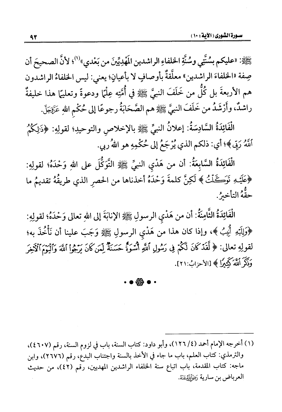 - صلى الله عليه وسلم -: "عليكم بسُنَّتِي وسُنَّةِ الخلفاءِ الراشدين المَهْدِيِّينَ من بَعْدي" (¬١)، لأنَّ الصحيحَ أن صِفة "الخلفاءَ الراشدين" معلَّقةٌ بأوصافٍ لا بأعيانٍ؛ يعني: ليس الخلفاءُ الراشدون هم الأربعةَ بل كُلُّ من خَلَفَ النبيَّ - صلى الله عليه وسلم - في أُمَّتِه عِلْمًا ودعوةً وتعليمًا هذا خليفةٌ راشدٌ، وأَرْشَدُ من خَلَفَ النبيَّ - صلى الله عليه وسلم - هم الصَّحَابَةُ رجوعًا إلى حُكْمِ اللهِ عَزَّ وَجَلَّ.