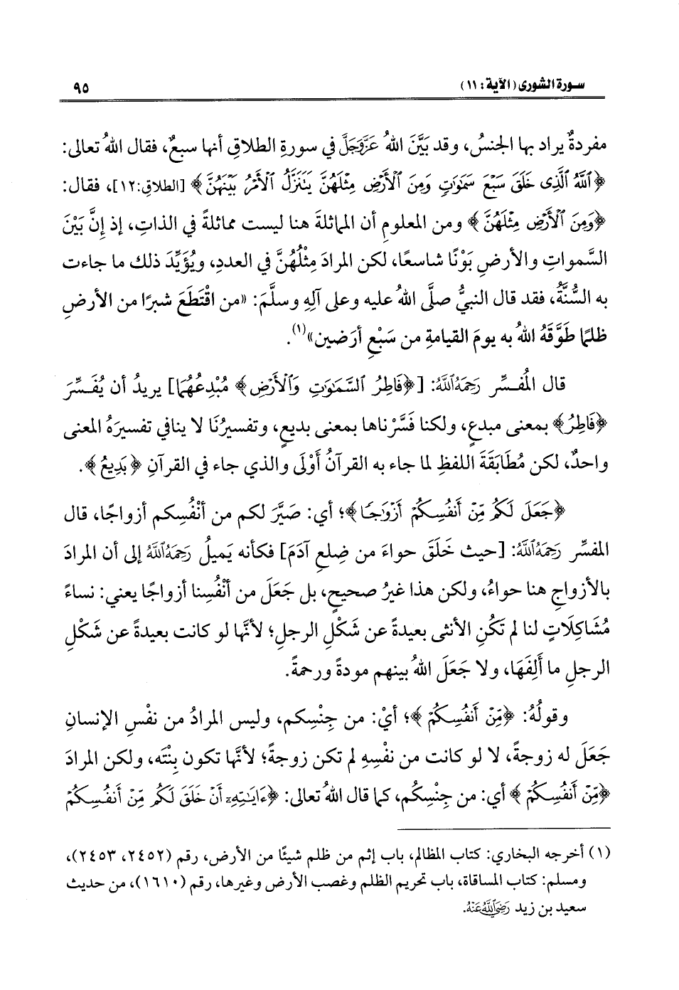 قال المُفسِّر رَحِمَهُ اللهُ: [{فَاطِرُ السَّمَاوَاتِ وَالْأَرْضِ} مُبْدِعُهُمَا] يريدُ أن يُفَسِّرَ {فَاطِرُ} بمعنى مبدعٍ، ولكنا فَسَّرْناها بمعنى بديعٍ، وتفسيرُنَا لا ينافي تفسيرَهُ المعنى واحدٌ، لكن مُطَابَقَةَ اللفظِ لما جاء به القرآنُ أَوْلَى والذي جاء في القرآنَ {بَدِيعُ}.