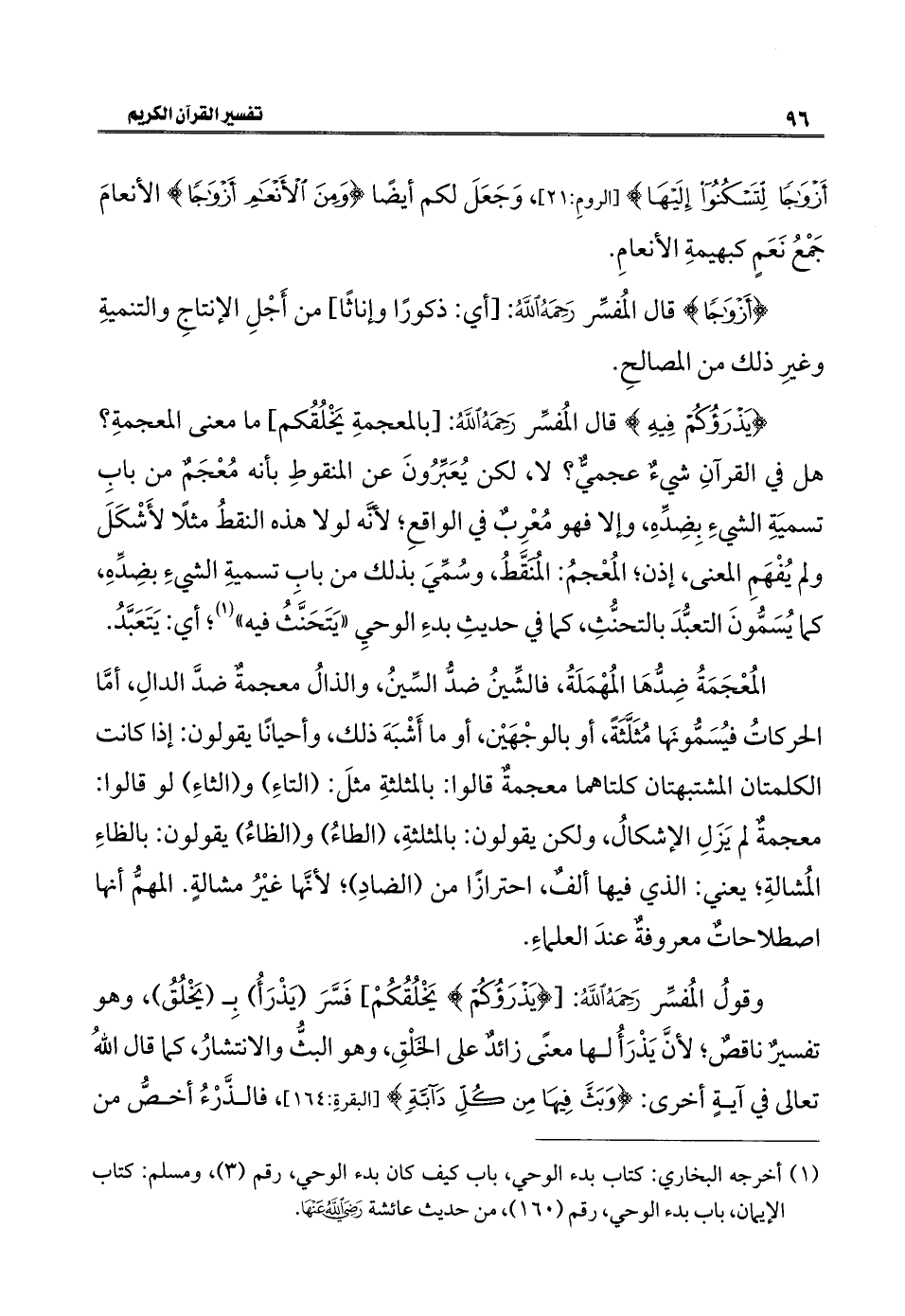 {يَذْرَؤُكُمْ فِيهِ} قال المُفسِّر رَحِمَهُ اللهُ: [بالمعجمةِ يَخْلُقُكم] ما معنى المعجمةِ؟ هل في القرآنِ شيءٌ عجميٌّ؟ لا، لكن يُعَبِّرُونَ عن المنقوطِ بأنه مُعْجَمٌ من بابِ تسميَةِ الشيءِ بِضِدِّهِ، وإلا فهو مُعْرِبٌ في الواقعِ؛ لأنَّه لولا هذه النقطُ مثلًا لأَشْكَلَ ولم يُفْهَمِ المعنى، إذن؛ المُعْجمُ: المُنَقَّطُ، وسُمِّيَ بذلك من باب تسميةِ الشيءِ بضِدِّهِ، كما يُسَمُّونَ التعبُّدَ بالتحنُّثِ، كما في حديثِ بدءِ الوحيِ "يَتَحَنَّثُ فيه" (¬١)؛ أي: يَتَعَبَّدُ.