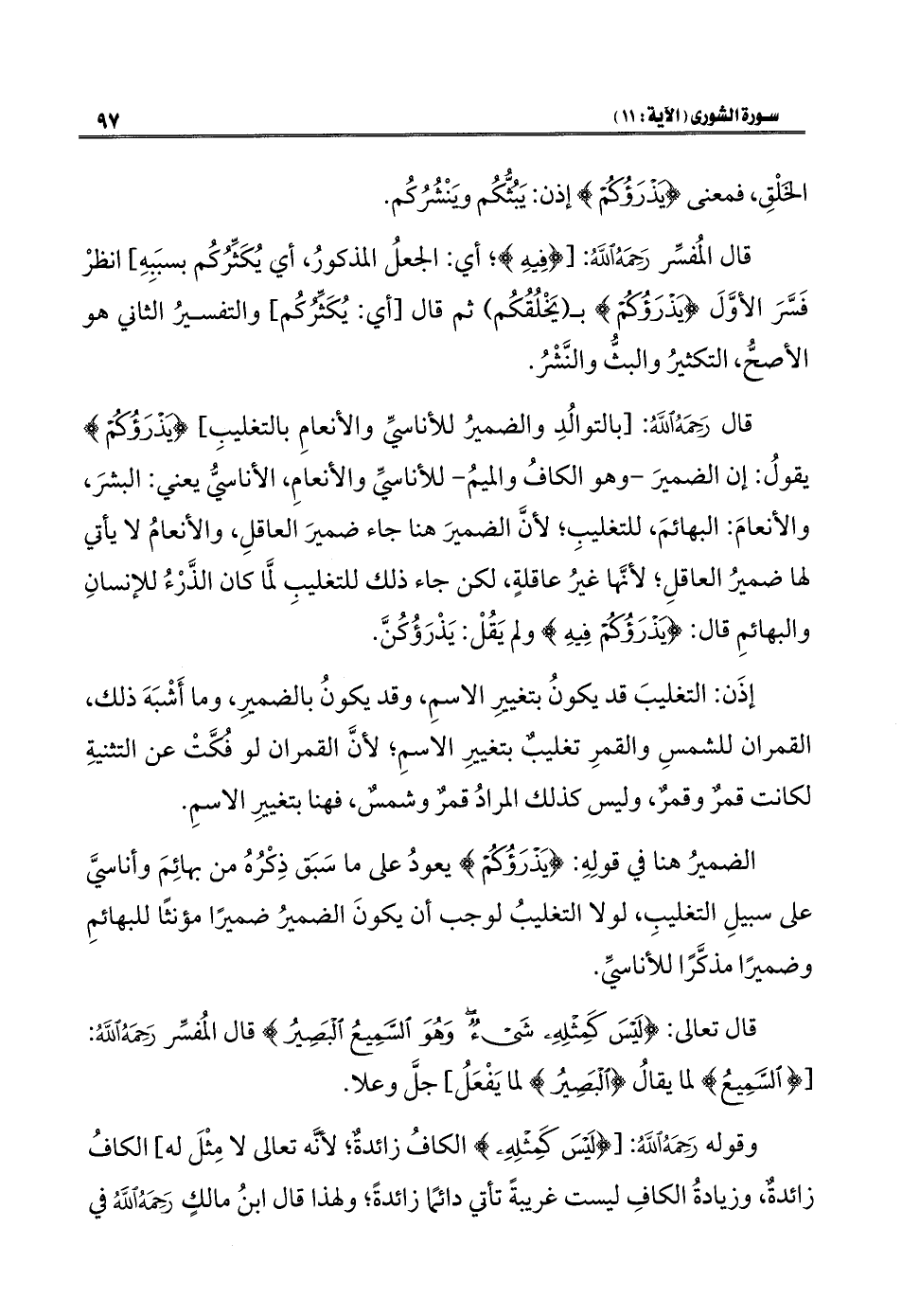 قال رَحِمَهُ اللهُ: [بالتوالُدِ والضميرُ للأناسيِّ والأنعامِ بالتغليبِ] {يَذْرَؤُكُمْ} يقولُ: إن الضميرَ - وهو الكافُ والميمُ - للأناسيِّ والأنعامِ، الأناسيُّ يعني: البشرَ، والأنعامَ: البهائمَ، للتغليبِ؛ لأنَّ الضميرَ هنا جاء ضميرَ العاقلِ، والأنعامُ لا يأتي لها ضميرُ العاقلِ؛ لأنَّها غيرُ عاقلةٍ، لكن جاء ذلك للتغليبِ لمَّا كان الذَّرْءُ للإنسانِ والبهائمِ قال: {يَذْرَؤُكُمْ فِيهِ} ولم يَقُلْ: يَذْرَؤُكُنَّ.