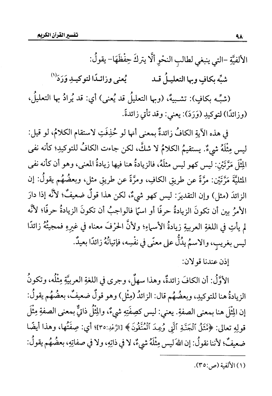 الأوَّلُ: أن الكافَ زائدةٌ، وهذا سهلٌ، وجرى في اللغةِ العربيَّةِ مِثْلُه، وتكونُ الزيادةُ هنا للتوكيدِ، وبعضُهُم قال: الزائدُ (مِثْل) وهو قولٌ ضعيفٌ، بعضُهُم يقولُ: إن المِثْلَ هنا بمعنى الصفةِ. يعني: ليس كصِفَتِهِ شيءٌ، والمِثْلُ ذاتيٌّ بمعنى الصفةِ مِثْلَ قولِهِ تعالى: {مَثَلُ الْجَنَّةِ الَّتِي وُعِدَ الْمُتَّقُونَ} [الرعد: ٣٥]؛ أي: صِفَتُها، وهذا أيضًا ضعيفٌ؛ لأننا نقولُ: إن اللهَ ليس مِثْلَهُ شيءٌ، لا في ذاتِهِ، ولا في صفاتِهِ، بعضُهُم يقولُ: