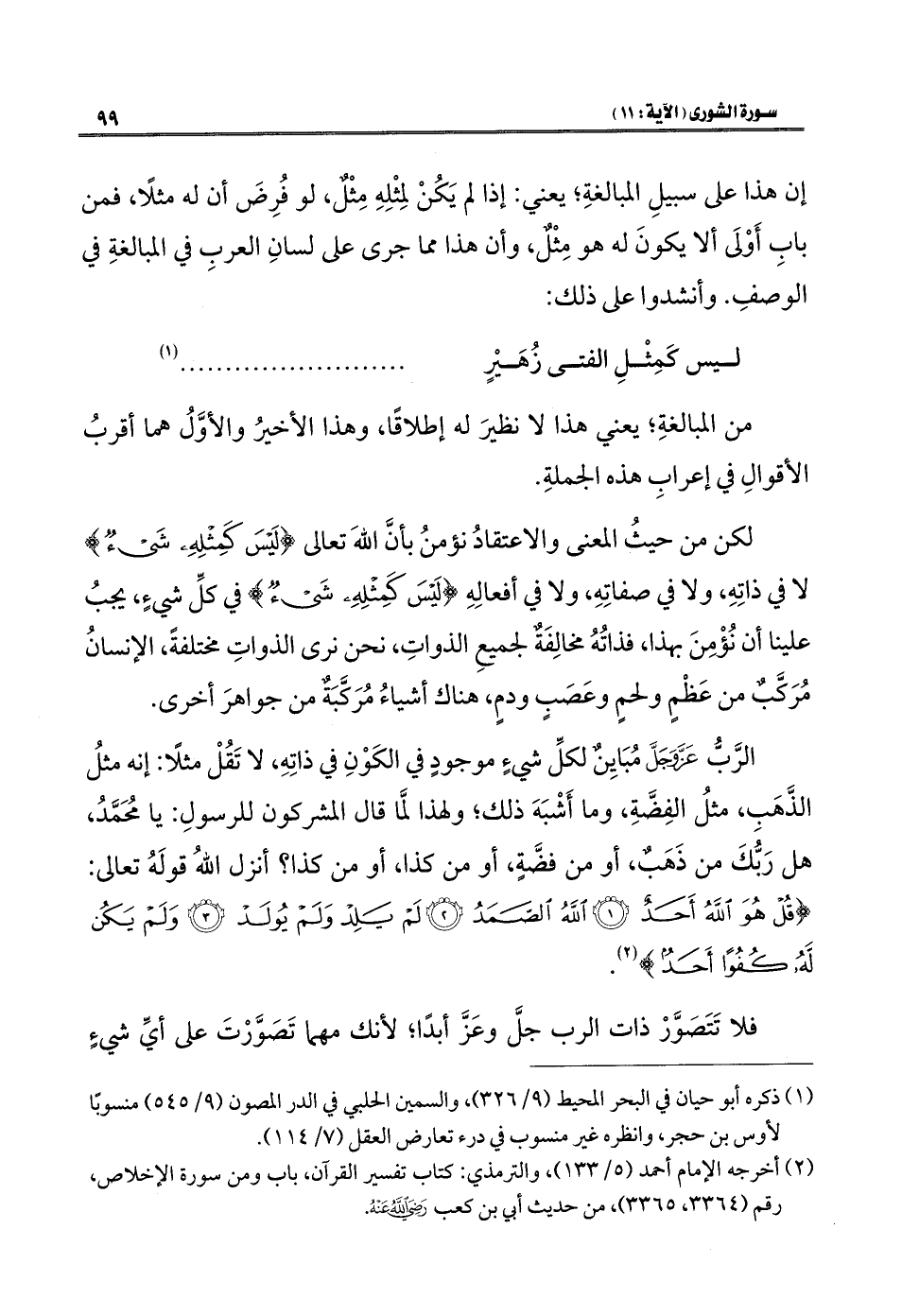 الرَّبُّ عَزَّ وَجَلَّ مُبَايِنٌ لكلِّ شيءٍ موجودٍ في الكَوْنِ في ذاتِهِ، لا تَقُلْ مثلًا: إنه مثلُ الذَّهَبِ، مثلُ الفِضَّةِ، وما أَشْبَهَ ذلك؛ ولهذا لمَّا قال المشركون للرسولِ: يا مُحَمَّدُ، هل رَبُّكَ من ذَهَبٌ، أو من فضَّةٍ، أو من كذا، أو من كذا؛ أنزل اللهُ قولَهُ تعالى: {قُلْ هُوَ اللَّهُ أَحَدٌ (١) اللَّهُ الصَّمَدُ (٢) لَمْ يَلِدْ وَلَمْ يُولَدْ (٣) وَلَمْ يَكُنْ لَهُ كُفُوًا أَحَدٌ} (¬٢).