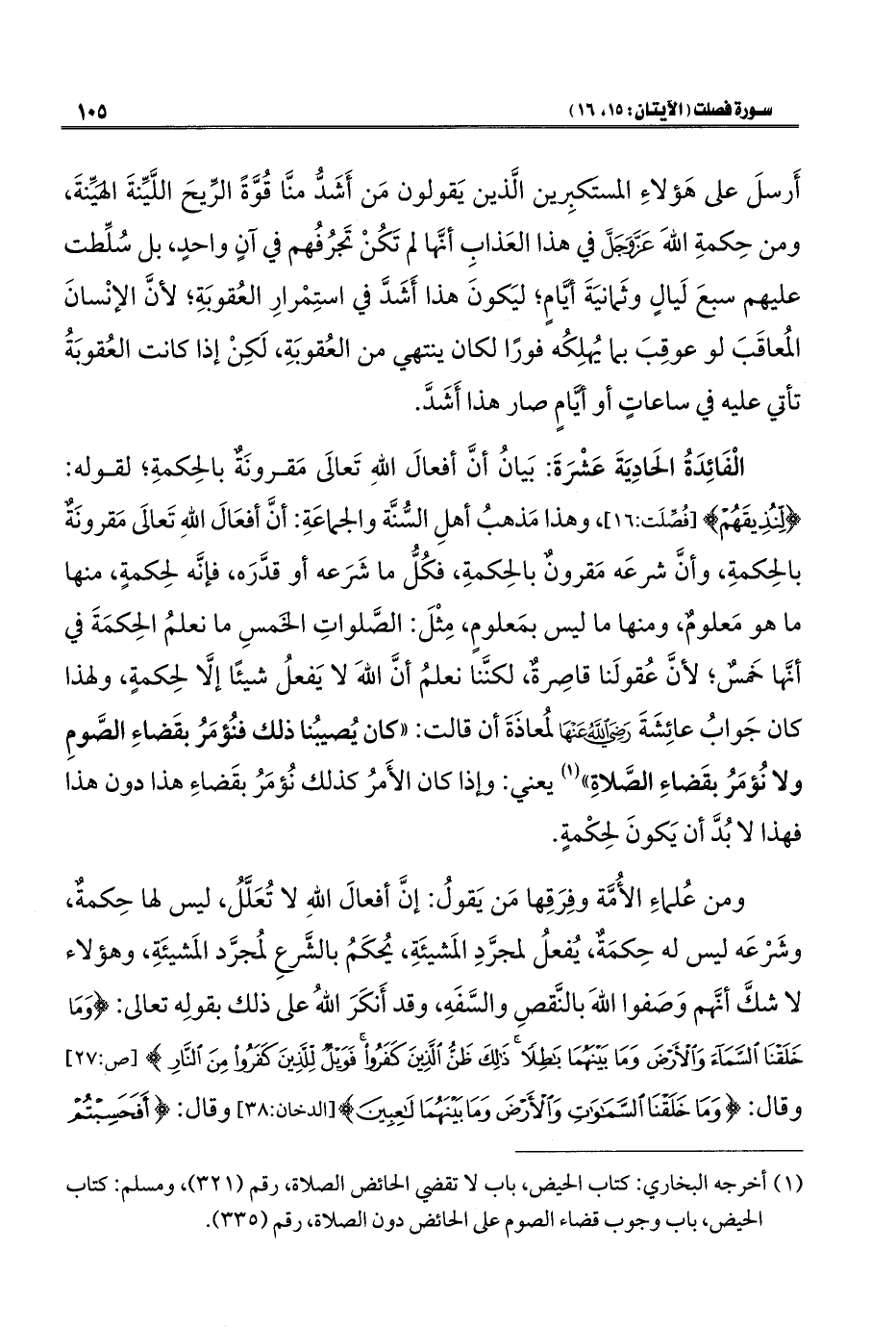 الْفَائِدَةُ الحَادِيَةَ عَشْرَةَ: بَيانُ أنَّ أفعالَ اللهِ تَعالَى مَقرونَةٌ بالحِكمةِ؛ لقوله: {لِنُذِيقَهُمْ} [فُصِّلَت: ١٦]، وهذا مَذهبُ أهلِ السُّنَّة والجماعَةِ: أنَّ أفعَالَ اللهِ تَعالَى مَقرونَةٌ بالحِكمةِ، وأنَّ شرعَه مَقرونٌ بالحِكمةِ، فكُلُّ ما شَرَعه أو قدَّرَه، فإنَّه لحِكمةٍ، منها ما هو مَعلومٌ، ومنها ما ليس بمَعلومٍ، مِثْلَ: الصَّلواتِ الخَمسِ ما نعلمُ الحِكمَةَ في أنَّها خَمسٌ؛ لأنَّ عُقولَنا قاصِرةٌ، لكنَّنا نعلمُ أنَّ اللهَ لا يَفعلُ شيئًا إلَّا لحِكمةٍ، ولهذا كان جَوابُ عائِشَةَ - رضي الله عنها - لمُعاذَةَ أن قالت: "كان يُصيبُنا ذلك فنُؤمَرُ بقَضاءِ الصَّومِ ولا نُؤمَرُ بقَضاءِ الصَّلاةِ" (¬١) يعني: وإذا كان الأَمرُ كذلك نُؤمَرُ بقَضاءِ هذا دون هذا فهذا لا بُدَّ أن يَكونَ لحِكْمةٍ.