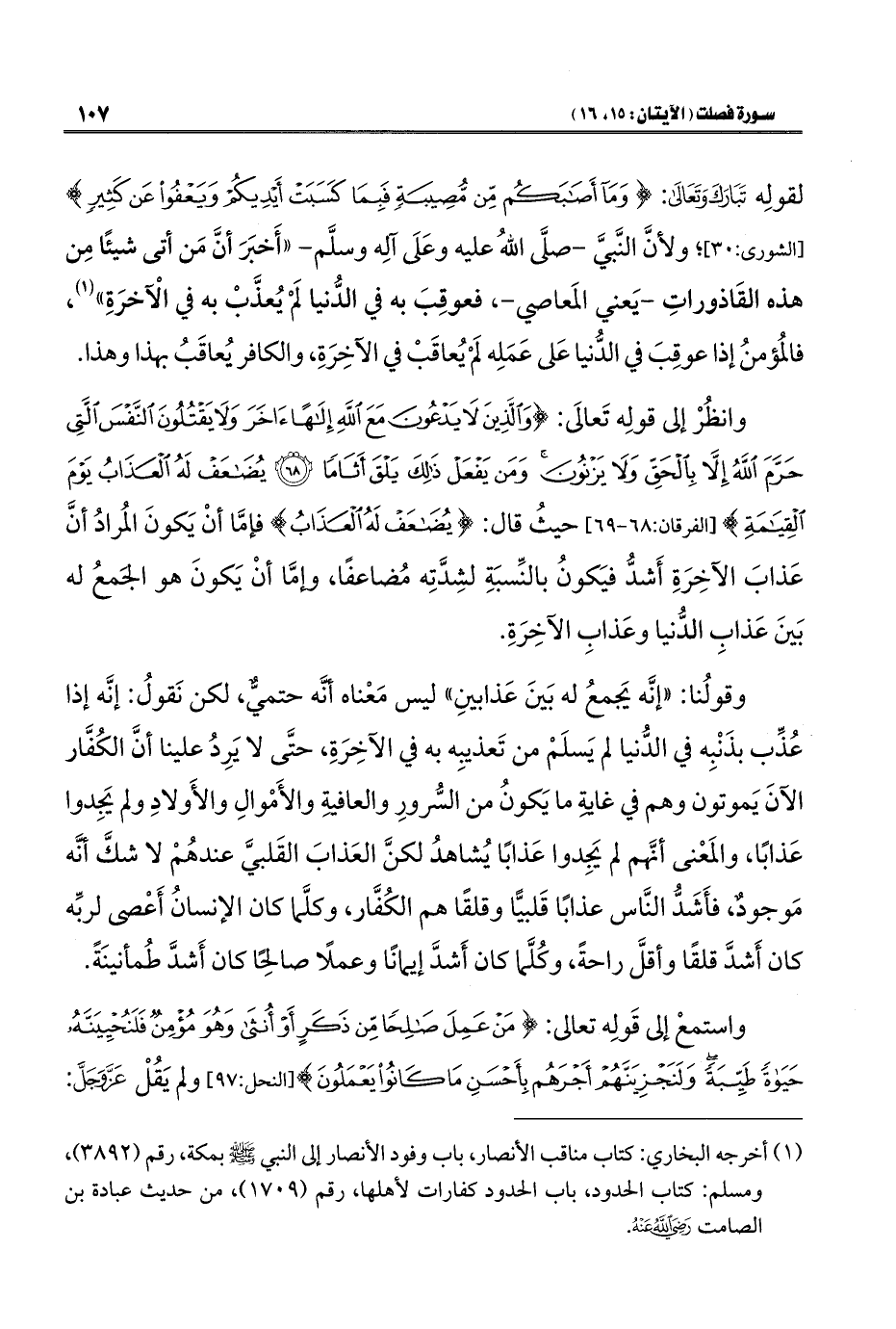 وانظُرْ إلى قولِه تَعالَى: {وَالَّذِينَ لَا يَدْعُونَ مَعَ اللَّهِ إِلَهًا آخَرَ وَلَا يَقْتُلُونَ النَّفْسَ الَّتِي حَرَّمَ اللَّهُ إِلَّا بِالْحَقِّ وَلَا يَزْنُونَ وَمَنْ يَفْعَلْ ذَلِكَ يَلْقَ أَثَامًا (٦٨) يُضَاعَفْ لَهُ الْعَذَابُ يَوْمَ الْقِيَامَةِ} [الفرقان: ٦٨ - ٦٩] حيثُ قال: {يُضَاعَفْ لَهُ الْعَذَابُ} فإمَّا أنْ يَكونَ المُرادُ أنَّ عَذابَ الآخِرَةِ أَشدُّ فيَكونُ بالنِّسبَةِ لشِدَّتِه مُضاعفًا، وإمَّا أنْ يَكونَ هو الجَمعُ له بَينَ عَذابِ الدُّنيا وعَذابِ الآخِرَةِ.