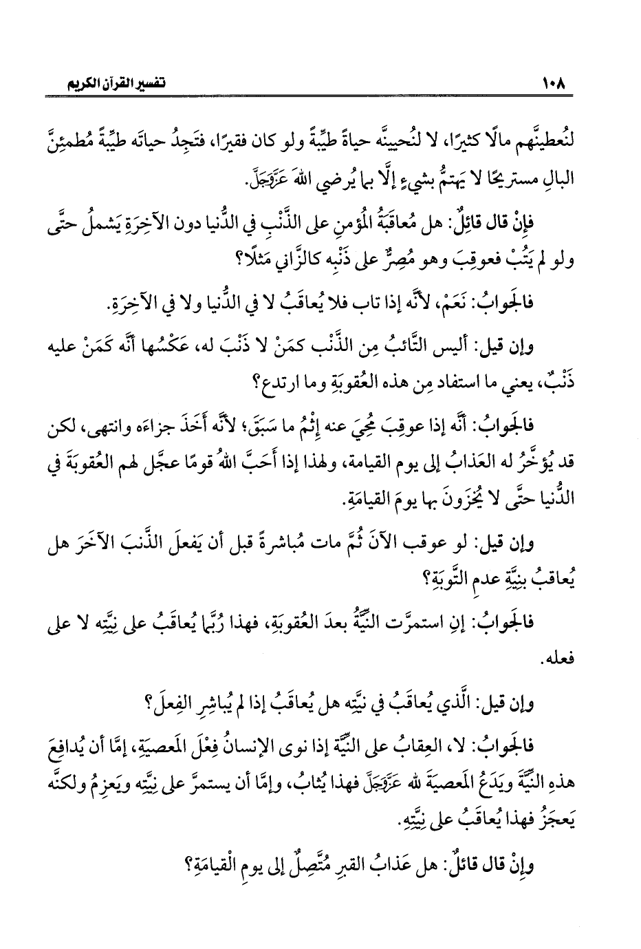 فإِنْ قال قائِلٌ: هل مُعاقَبَةُ المُؤمنِ على الذَّنْبِ في الدُّنيا دون الآخِرَةِ يَشملُ حتَّى ولو لم يَتُبْ فعوقِبَ وهو مُصِرٌّ على ذَنْبِه كالزَّاني مَثلًا؟