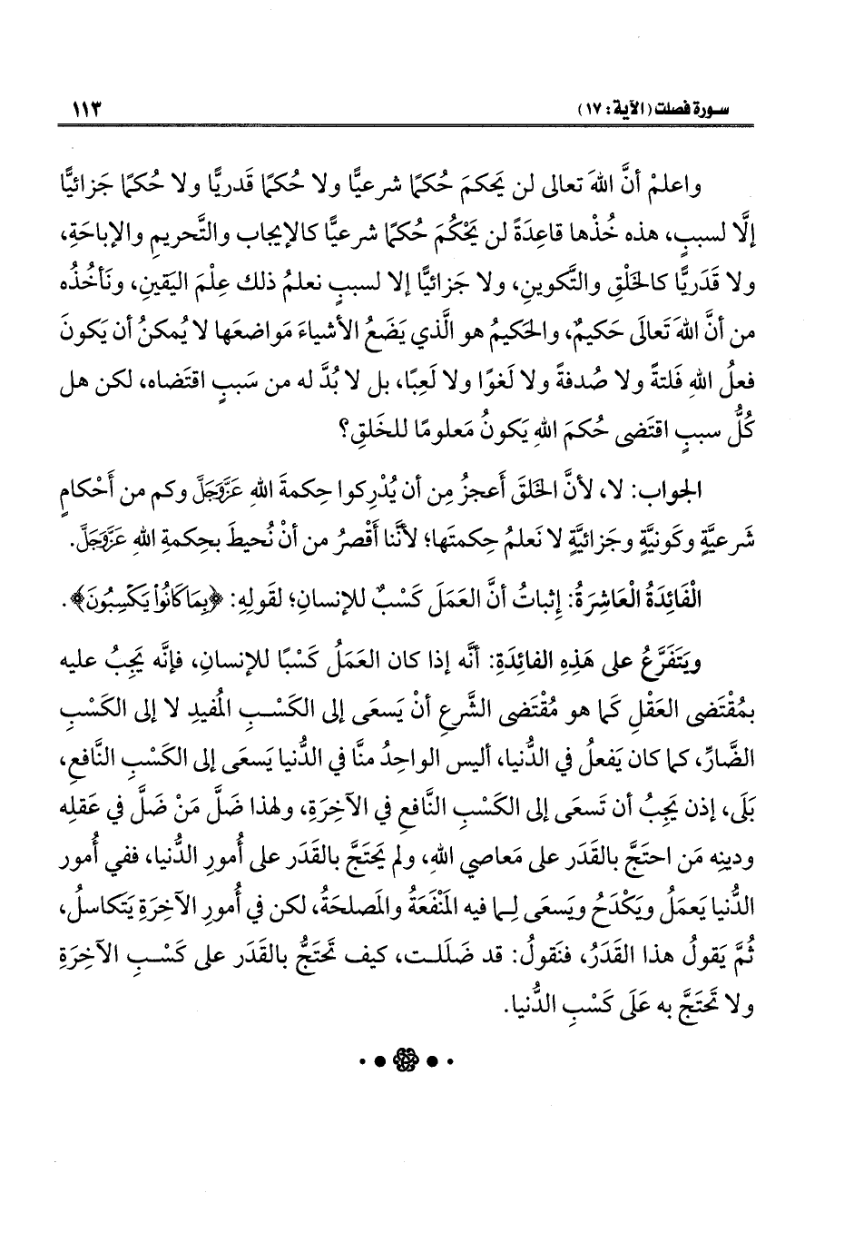 ويَتَفَرَّعُ على هَذِهِ الفائِدَةِ: أنَّه إذا كان العَمَلُ كَسْبًا للإنسانِ، فإنَّه يَجِبُ عليه بمُقْتَضى العَقْلِ كَما هو مُقْتَضى الشَّرعِ أنْ يَسعَى إلى الكَسْبِ المُفيدِ لا إلى الكَسْبِ الضَّارِّ، كما كان يَفعلُ في الدُّنيا، أليس الواحِدُ منَّا في الدُّنيا يَسعَى إلى الكَسْبِ النَّافعِ، بَلَى، إذن يَجِبُ أن تَسعَى إلى الكَسْبِ النَّافعِ في الآخِرَةِ، ولهذا ضَلَّ مَنْ ضَلَّ في عَقلِه ودينِه مَن احتَجَّ بالقَدَر على مَعاصي اللهِ، ولم يَحتَجَّ بالقَدَر على أُمورِ الدُّنيا، ففي أُمور الدُّنيا يَعمَلُ وَيكْدَحُ ويَسعَى لِما فيه المَنْفَعَةُ والمَصلحَةُ، لكن في أُمورِ الآخِرَةِ يَتكاسلُ، ثُمَّ يَقولُ هذا القَدَرُ، فنَقولُ: قد ضَلَلت، كيف تَحتَجُّ بالقَدَر على كَسْبِ الآخِرَةِ ولا تَحتَجَّ به عَلَى كَسْبِ الدُّنيا.