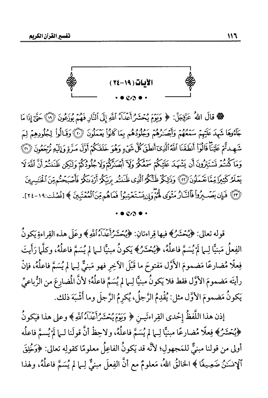 قوله تعالى: {يُحْشَرُ} فيها قِراءتانِ: {يُحْشَرُ أَعْدَاءُ اللَّهِ} وعَلَى هذه القِراءةِ يَكونُ الفِعلُ مَبنيًّا لِما لَمْ يُسَمَّ فاعلُهُ، {يُحْشَرُ} يَكونُ مبنيًّا لما لم يُسَمَّ فاعلُهُ، وكلَّما رَأَيتَ فِعلًا مُضارعًا مَضمومَ الأَوَّل مَفتوحَ ما قَبْلَ الآخِرِ فهو مَبنيٌ لِما لم يُسَمَّ فاعلُهُ، فإنْ رأيتَه مَضمومَ الأوَّل فقط فلا يَكونُ مبنيًّا لِما لم يُسَمَّ فاعلُهُ؛ لأنَّ المُضارعَ من الرُّباعيِّ يَكونُ مَضمومَ الأوَّل مثل: يُقْدِمُ الرَّجلُ، يُكرِمُ الرَّجلَ وما أَشْبَهَ ذلك.
