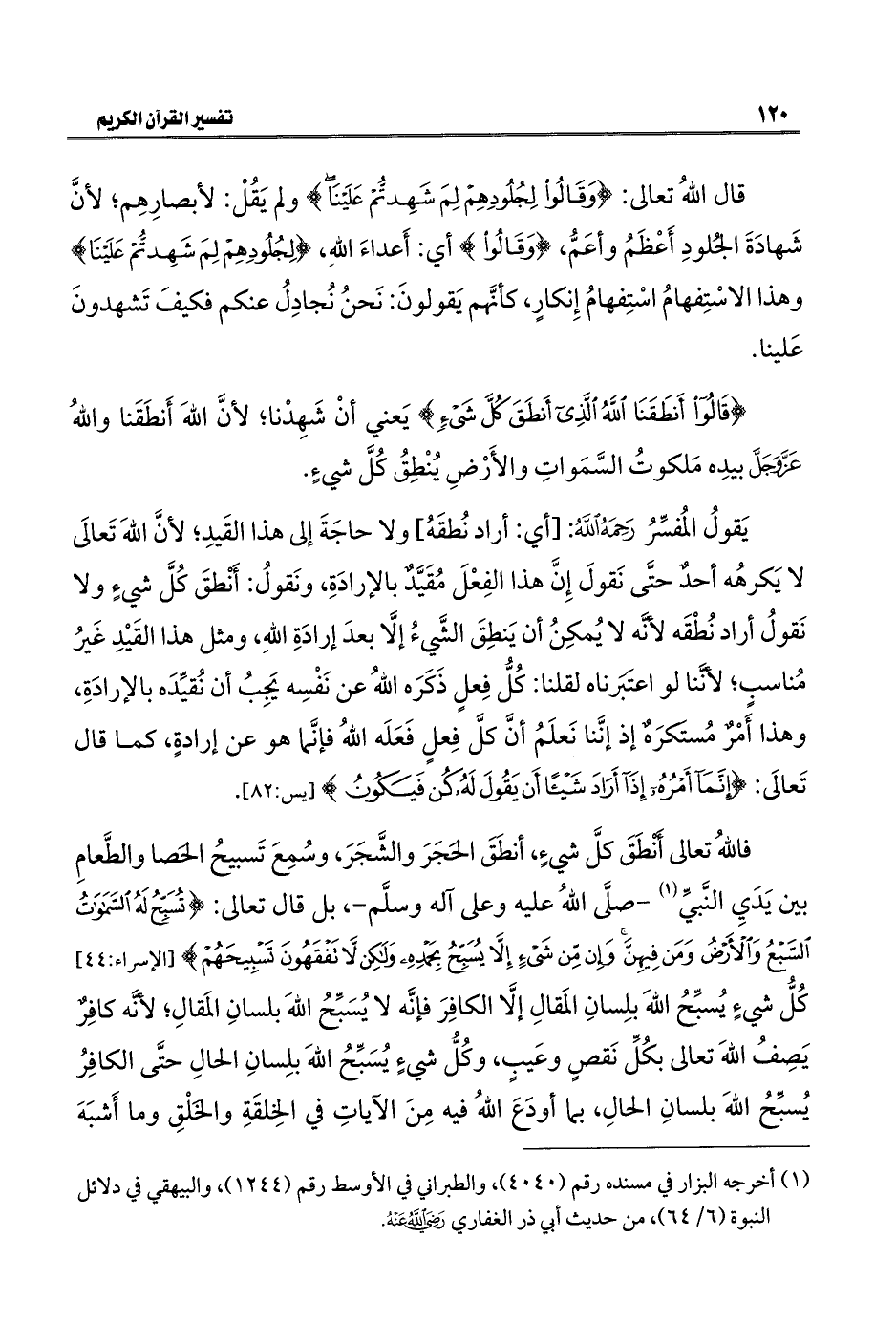 يَقولُ المُفسِّرُ رَحِمَهُ اللهُ: [أي: أراد نُطقَهُ] ولا حاجَةَ إلى هذا القَيدِ؛ لأنَّ اللهَ تَعالَى لا يَكرهُه أحدٌ حتَّى نَقولَ إِنَّ هذا الفِعْلَ مُقَيَّدٌ بالإرادَةِ، ونَقولُ: أَنْطقَ كُلَّ شيءٍ ولا نَقولُ أراد نُطْقَه لأنَّه لا يُمكِنُ أن يَنطِقَ الشَّيءُ إلَّا بعدَ إرادَةِ اللهِ، ومثل هذا القَيْدِ غَيرُ مُناسبٍ؛ لأنَّنا لو اعتَبَرناه لقلنا: كُلُّ فِعلٍ ذَكَرَه اللهُ عن نَفْسِه يَجِبُ أن نُقيِّدَه بالإرادَةِ، وهذا أَمْرٌ مُستَكرَهٌ إذ إنَّنا نَعلَمُ أنَّ كلَّ فِعلٍ فَعَلَه اللهُ فإنَّما هو عن إرادةٍ، كما قال تَعالَى: {إِنَّمَا أَمْرُهُ إِذَا أَرَادَ شَيْئًا أَنْ يَقُولَ لَهُ كُنْ فَيَكُونُ} [يس: ٨٢].