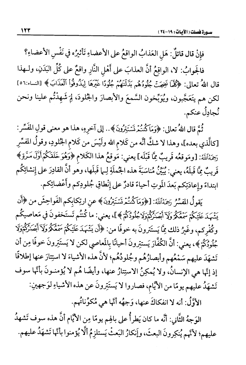 ثُمَّ قال اللهُ تعالى: {وَمَا كُنْتُمْ تَسْتَتِرُونَ} .. إلى آخرِهِ، هذا هو معنى قولِ المفَسِّر: [كالَّذي بعده]، وهذا لا شكَّ أنَّه من كَلامِ الله ولَيْسَ من كَلامِ الجُلودِ، وقولُ المفسِّرِ رَحِمَهُ اللهُ: [ومَوقعُه قَريبٌ مِمَّا قَبْلَه] يعني: مَوقعُ هذا الكَلامِ {وَهُوَ خَلَقَكُمْ أَوَّلَ مَرَّةٍ} قَريبٌ مِما قَبلَهُ، يعني: يُبَيِّنُ مُناسَبَةَ هذه الجُملَةِ لِما قَبلَها، وهو أنَّ القادِرَ على إِنشائِكُم ابتداءً وإِعادَتِكم بَعدَ المَوتِ أحياءً قادرٌ على إِنْطاقِ جُلودِكم وأَعْضائِكم.