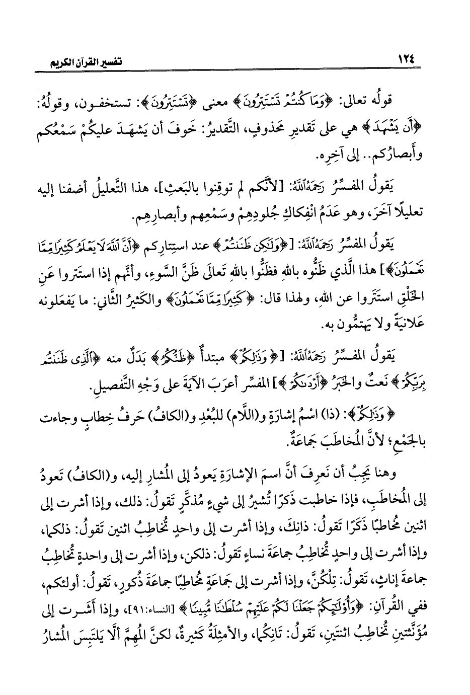 يَقولُ المفسِّرُ رَحِمَهُ اللهُ: [{وَلَكِنْ ظَنَنْتُمْ} عند استِتارِكم {أَنَّ اللَّهَ لَا يَعْلَمُ كَثِيرًا مِمَّا تَعْمَلُونَ}] هذا الَّذي ظَنُّوه باللهِ فظَنُّوا باللهِ تَعالَى ظَنَّ السَّوءِ، وأنَّهم إذا استَتروا عَنِ الخَلْقِ استَتَروا عن اللهِ، ولهذا قال: {كَثِيرًا مِمَّا تَعْمَلُونَ} والكَثيرُ الثَّاني: ما يَفعَلونه عَلانيَةً ولا يَهتمُّون به.