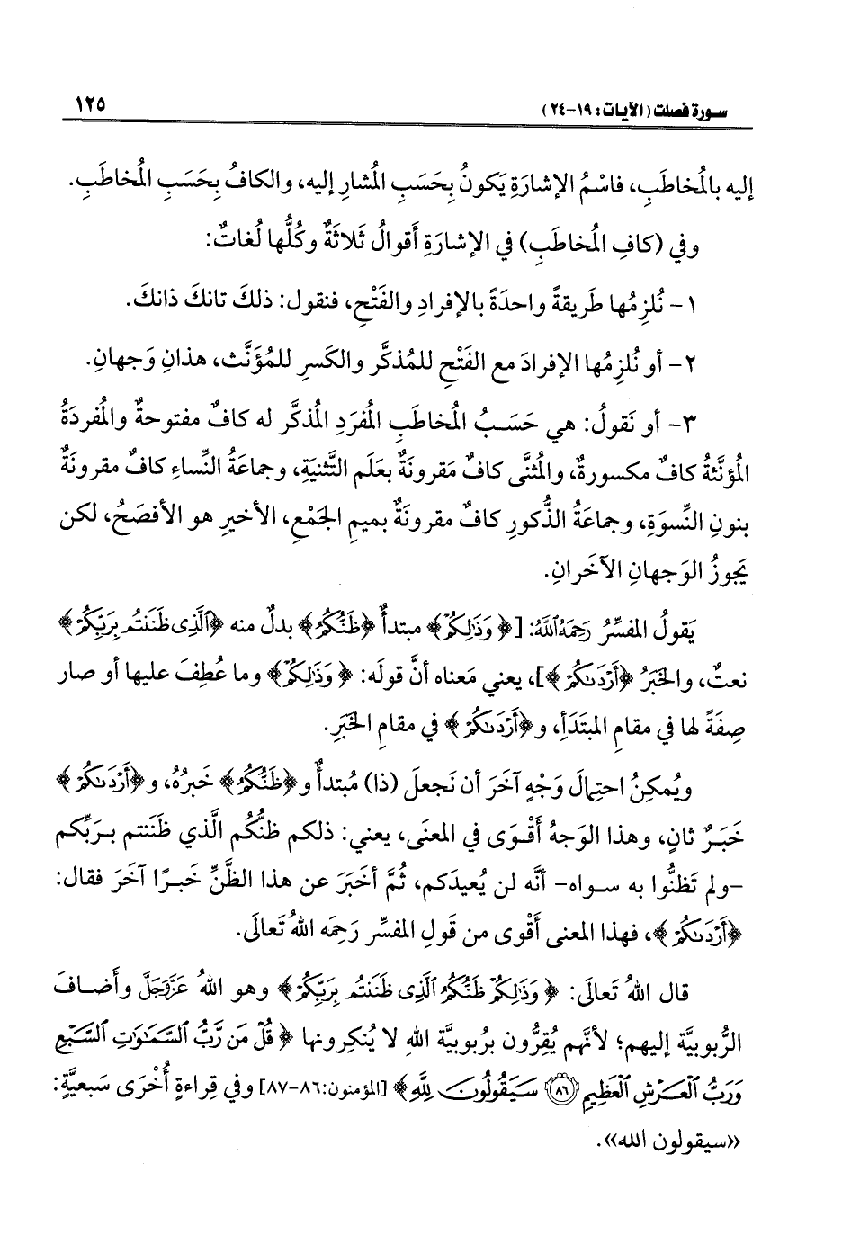 ويُمكِنُ احتِمالَ وَجْهٍ آخَرَ أن نَجعلَ (ذا) مُبتدأٌ و {ظَنُّكُمُ} خَبرُهُ، و {أَرْدَاكُمْ} خَبَرٌ ثانٍ، وهذا الوَجهُ أَقْوَى في المعنَى، يعني: ذلكم ظنُّكُم الَّذي ظَنَنتم برَبِّكم -ولم تَظنُّوا به سواه- أنَّه لن يُعيدَكم، ثُمَّ أخَبَرَ عن هذا الظَّنِّ خَبرًا آخَرَ فقال: {أَرْدَاكُمْ}، فهذا المعنى أَقْوى من قَولِ المفسِّر رَحِمَه اللهُ تَعالَى.