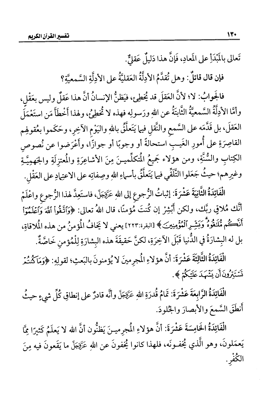 الْفَائِدَةُ الثَّانِيَةَ عَشْرَةَ: إثباتُ الرُّجوعِ إلى اللهِ عَزَّ وَجَلَّ، فاستَعِدَّ لهذا الرُّجوعِ واعْلَمْ أنَّك مُلاقٍ ربَّك، ولكن أَبْشِرْ إن كنتَ مُؤمنًا، قال اللهُ تعالى: {وَاتَّقُوا اللَّهَ وَاعْلَمُوا أَنَّكُمْ مُلَاقُوهُ وَبَشِّرِ الْمُؤْمِنِينَ} [البقرة: ٢٢٣] يعني لا يَخافُ المُؤمنُ من هذه المُلاقاةِ، بل له البِشارَةُ في الدُّنيا قَبْلَ الآخِرَةِ، لكنَّ حَقيقَةَ هذه البِشارَةِ لِلْمُؤمنِ خَاصَّةٌ.