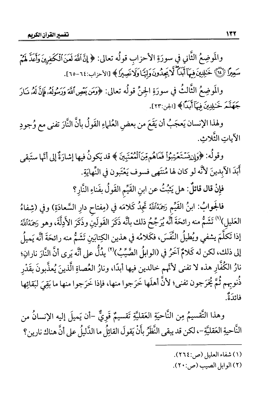 فالجَوابُ: ابنُ القَيِّمِ رَحِمَهُ اللهُ تَجِدُ كَلامَه في (مِفتاحِ دارِ السَّعادَةِ) وفي (شِفاءُ العَليلِ) (¬١) تَشَمُّ منه رائحَةَ أنَّه يُرَجِّحُ ذلك بأنَّه ذَكَرَ القَولَينِ وذَكَرَ الأَدِلَّةَ، وهو رَحِمَهُ اللهُ إذا تَكلَّمَ يشفي ويُطيلُ النَّفَسَ، فكَلامُه في هذين الكِتابَينِ تَشَمُّ منه رائحَةَ أنَّه يَميلُ إلى ذلك، لكن له كَلامٌ آخَرُ في (الوابلُ الصَّيِّبُ) (¬٢) يدُلُّ على أنَّه يَرى أنَّ النَّارَ نارانِ؛ نارُ الكُفَّارِ هذه لا تفنى لأنَّهم خالدين فيها أبدًا، ونارُ العُصاةِ الَّذينَ يُعذَّبونَ بقَدْرِ ذُنوبِهم ثُمَّ يُخرَجون تفنى؛ لأنَّ أهلَها خَرَجوا منها، فإذا خَرَجوا منها ما بَقِيَ لبَقائِها فائدَةٌ.